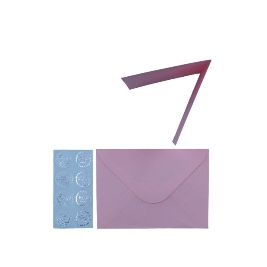 Käytännöllinen setti kortinlähettäjälle: yhdessä pakkauksessa on 5 korttia ja 5 vastaavan väristä kirjekuorta. Lisäksi mukana tulee 8 kpl kiitos tarroja. Sopii kutsuihin, onnittelukortteihin ja lahjakortteihin — siisti ja helppo tapa viimeistellä lahjat ja viestit.