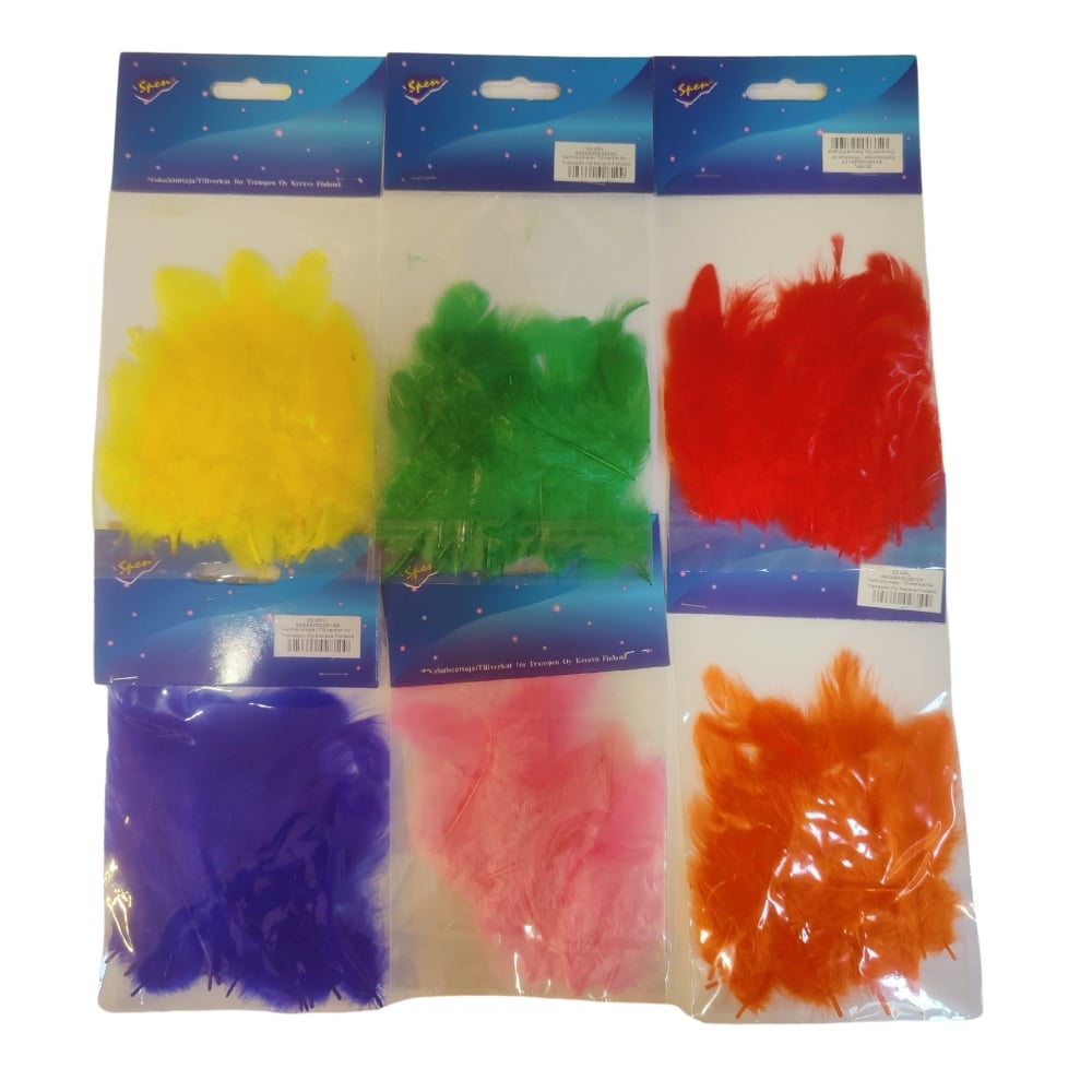 Noin kymmenen koristehöyhentä pääsiäiskoristeluun tai muuhun askarteluun. Eri värivaihtoehtoja.