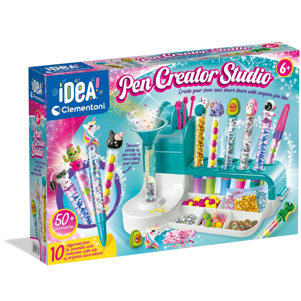 - Pakkaus sisältää työaseman ja tarvikkeet kymmenen erilaisen kynän kokoamiseen, mm. korkkeja, hylsyjä, koristeita, hahmoja ja glitteriä.