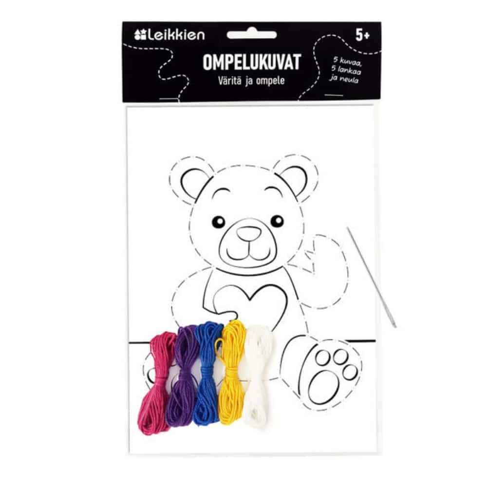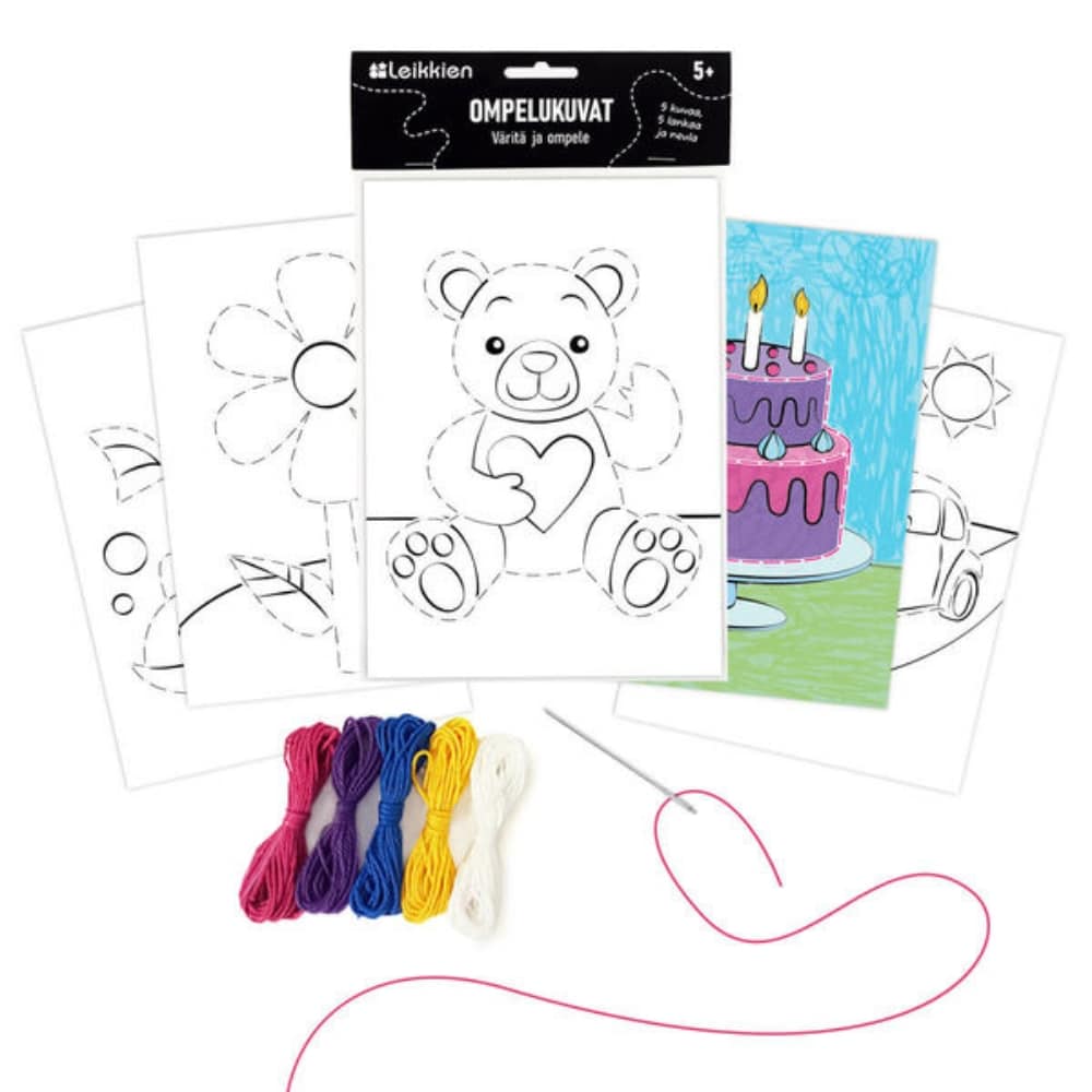Ompelukuva ompele ja väritä 5 kuvaa – väritä ja ompele! Perinteiset kartonkiset ompelukuvat voi myös värittää. Leikkien Ompelukuvat -askartelusetti sisältää viisi väritettävää ompelukuvaa, viisi eriväristä puuvillalankaa ja tylpän kanavaneulan.