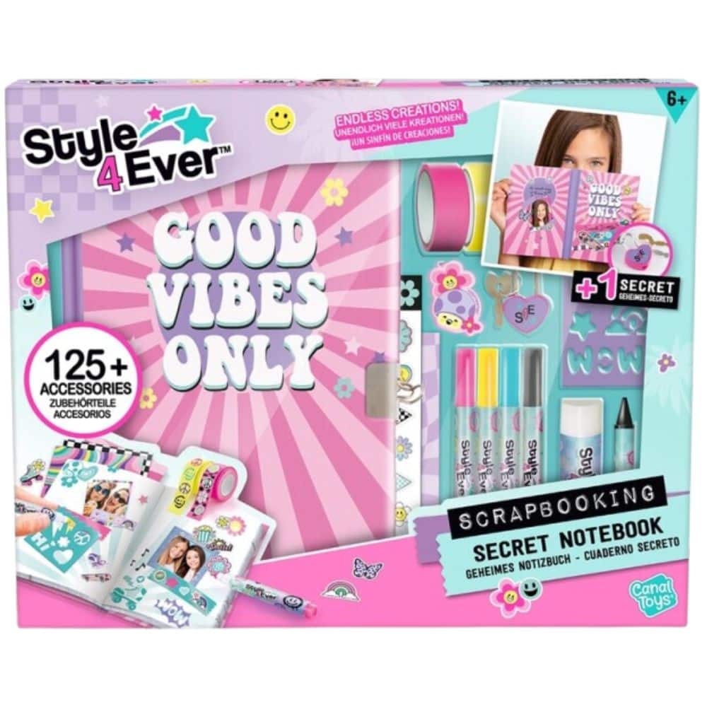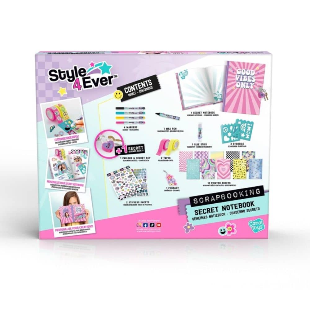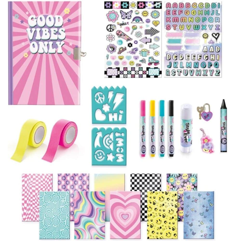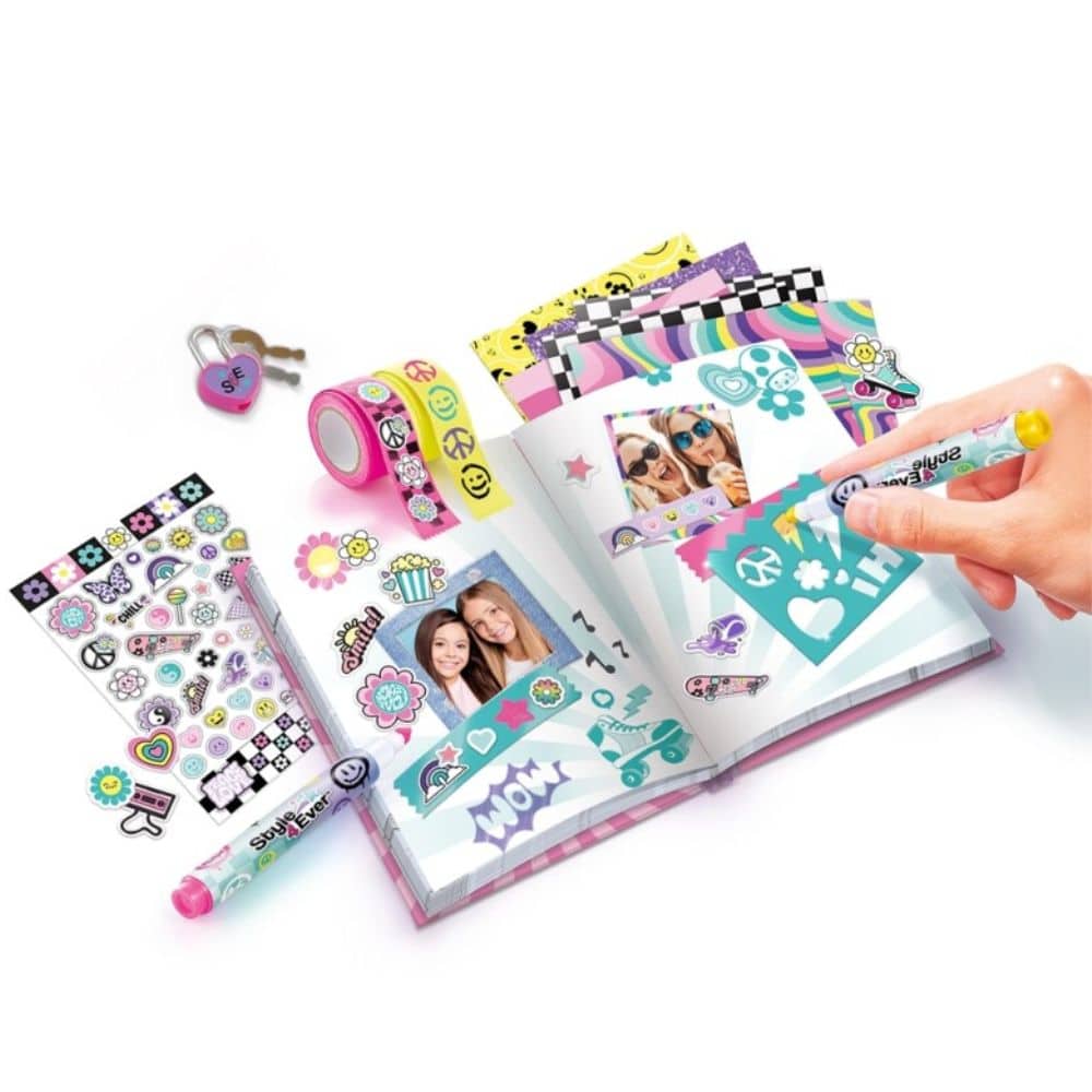 Suunnittele itsellesi leike- tai päiväkirja mukana tulevilla tarvikkeilla. Kirjassa lukko. Mukana mm. tusseja, teippejä, sapluunoita ja tarroja.