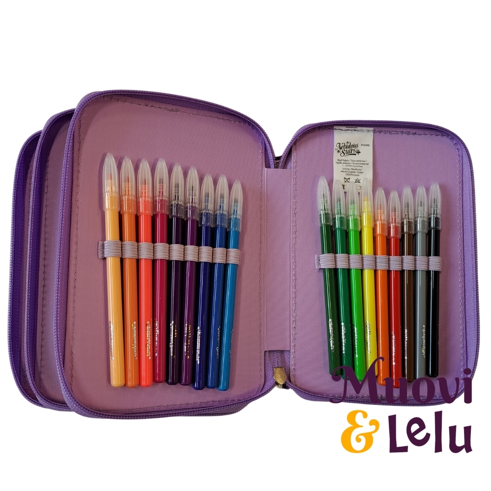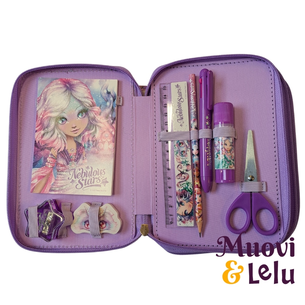 Upea penaali Nebulous Stars, jossa on kolme taskua ja runsaasti tarvikkeita. Nebulous Stars on kanssasi kaikkialla tukemassa sinua kuten myös koulussa ja se on näyttävä sisältä ja päältä! Luksus penaalin mukana tulee kaikki mitä tarvitset värittämiseen, piirtämiseen ja kirjoittamiseen kotona koulussa: pyyhekumi, viivotin, lyijykynä, sakset, liima kuulakärkikynä, terotin, pieni väritys-/ tehtävävihko, 18 väripuukynää ja 18 väritussia. Suositellaan 7-vuotiaasta alkaen.