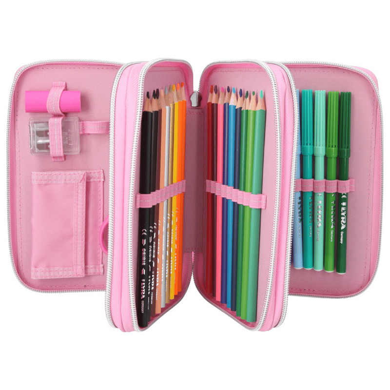 Upean penaalin kolme vetoketjuin suljettavaa kerrosta pitää sisällään kaiken mitä piirtämiseen ja kirjoittamiseen tarvitset vapaa-ajalle ja kouluun: 18 kpl Lyra merkkistä puuvärikynää ja 18 kpl tusseja, kaksi Lyra lyijykynää, viivoittimen, sakset, liiman, pyyhekumin, teroittimen ja pienen säilytystaskun.