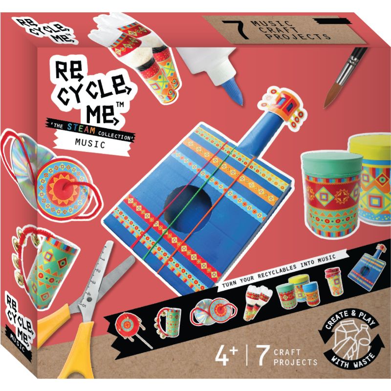 Tämä upea musiikkisoitinaiheinen Re-Cycle-Me -pakkaus tarjoaa lapsellesi tunneiksi luovia leikkejä! Pakkaus sisältää erilaisia materiaaleja seitsemän eri musiikkisoittimen, kuten kitaran ja käsirumpujen rakentamiseen. Vain maitopurkit, vessapaperirullat, munakennot, tölkit ja CD-levyt täytyy kerätä itse. Tarvitset myös liimaa ja sakset.
