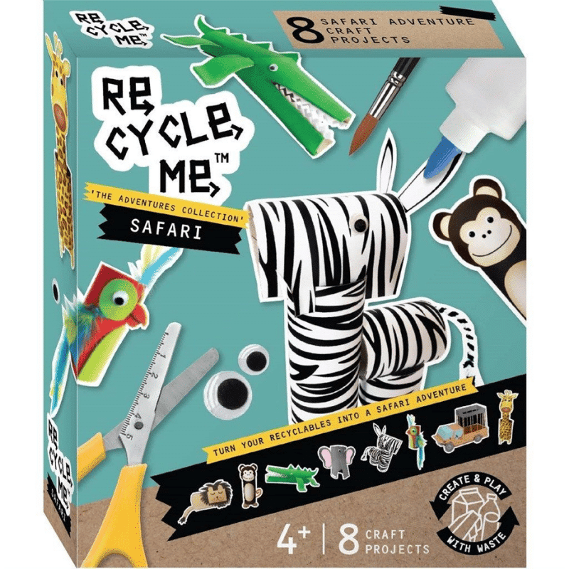 Tämä upea Re-Cycle-Me Safariseikkailu -pakkaus tarjoaa lapsellesi tunneiksi luovaa leikkiaikaa! Pakkaus sisältää erilaisia materiaaleja leijonan, kirahvin, apinan, krokotiilin, seepran, linnun, elefantin ja safariauton rakentamiseen. Tarvitset lisäksi maitotölkkejä ja vessapaperirullia, sekä liimaa ja sakset.