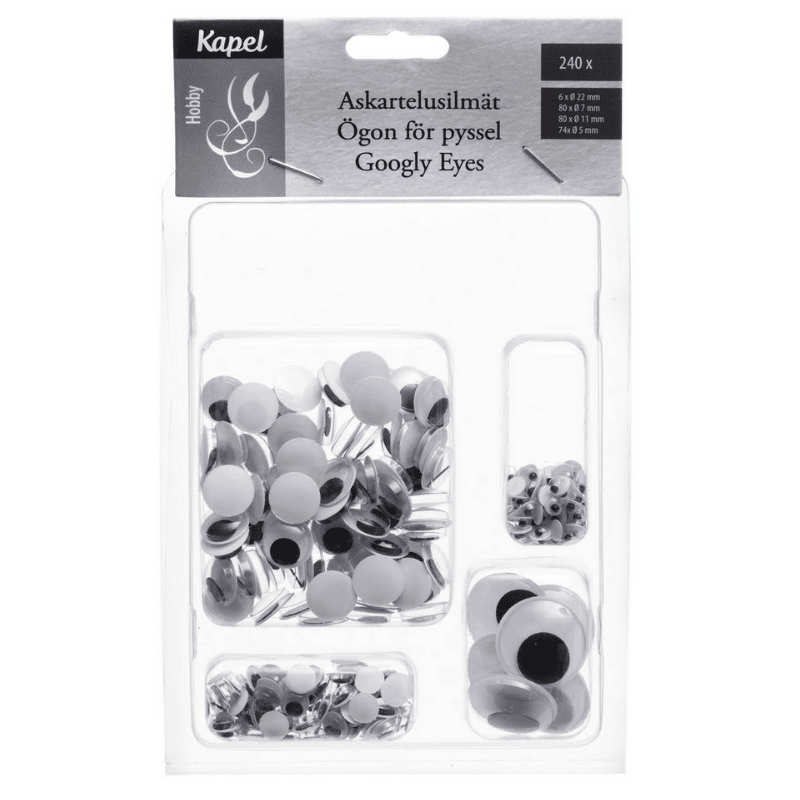 Askarteluun tarkoitettuja silmiä. Neljä eri kokoa pakkauksessa.