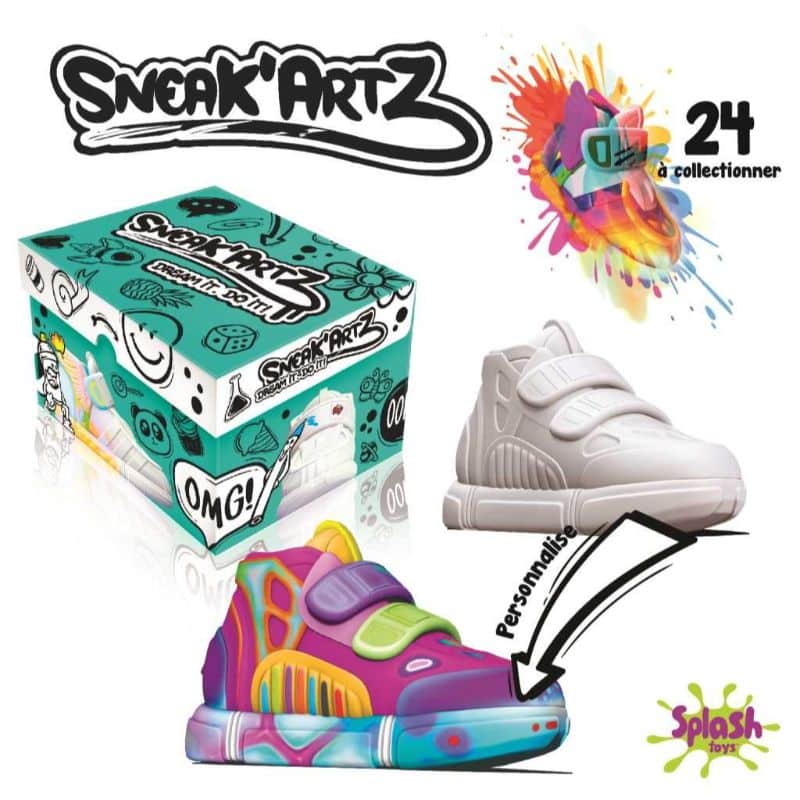 Sneak’artz tennari, jonka saat itse värittää sen väriseksi ja näköiseksi kuin haluat. Lajitelmassa on neljä eriväristä pakkausta, joista jokaisesta voi tulla mikä tahansa 24:stä erimallisesta tennarista. Millaisen tennarin sinä saat ja minkä näköiseksi päätät värjätä sen?