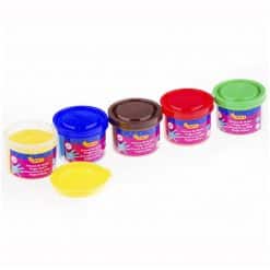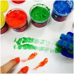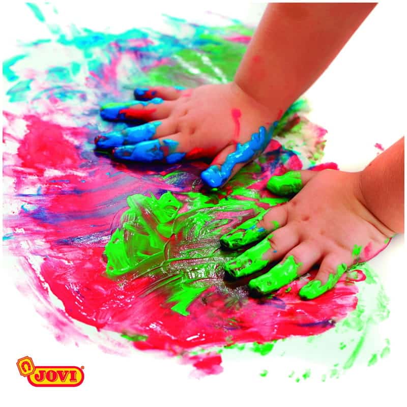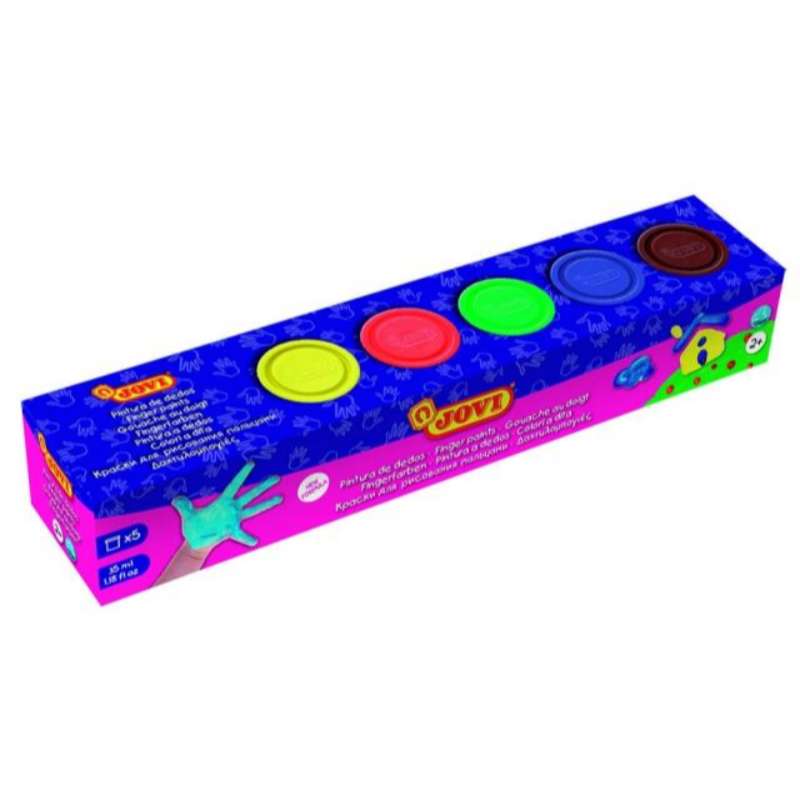 5 purkkia x 35 ml sormivärejä Jovi-laatua. Sormivärejä voi myös levittää pensseleillä, pienten on helpompi värittää.