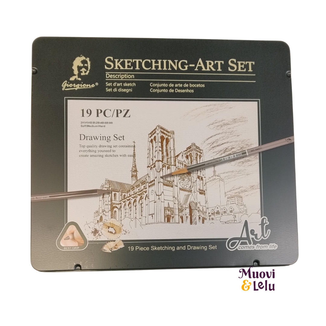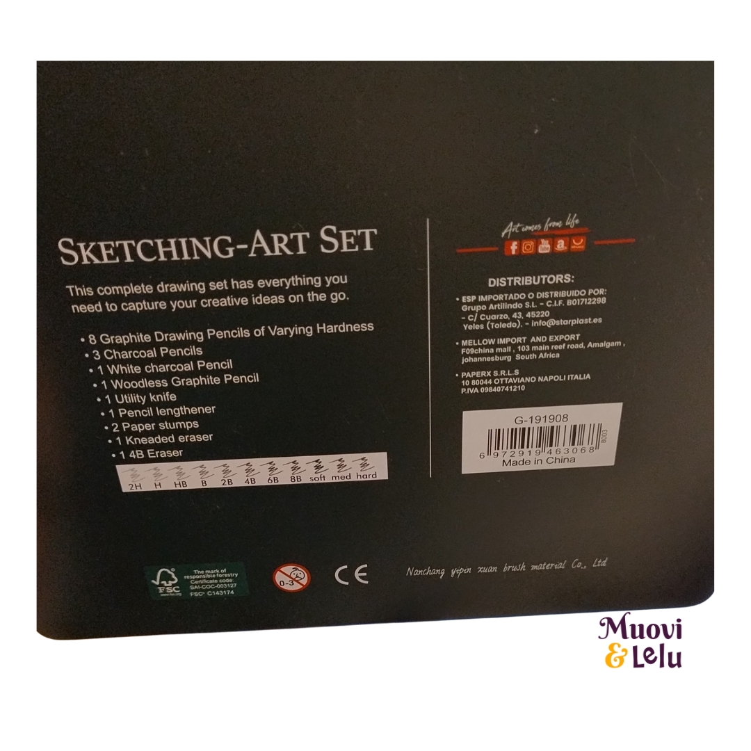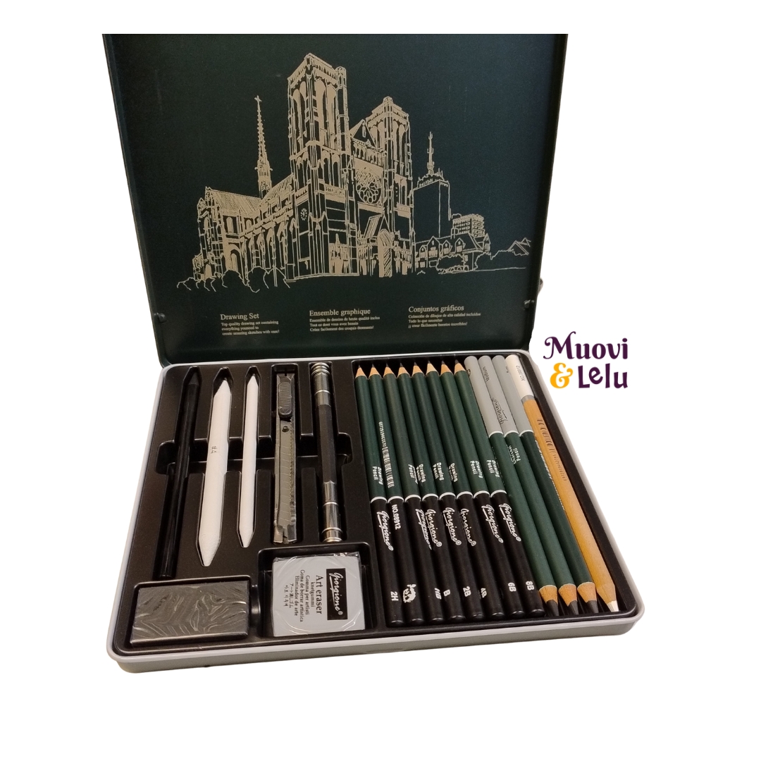 Täydellinen piirustussetti luovaan työskentelyyn. Mukana kaikki tarvittava luonnosteluun, varjostukseen ja yksityiskohtaiseen piirtämiseen – niin kotona kuin matkalla.