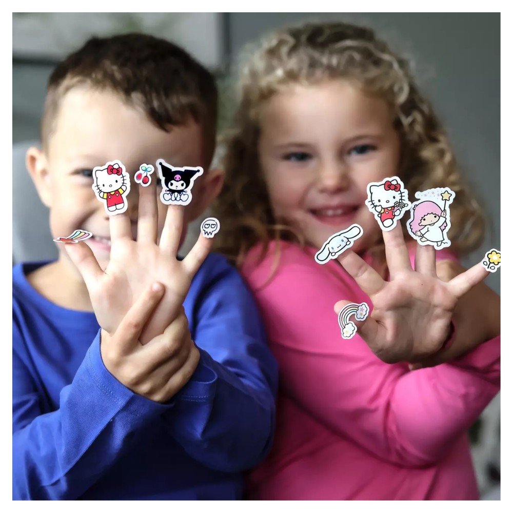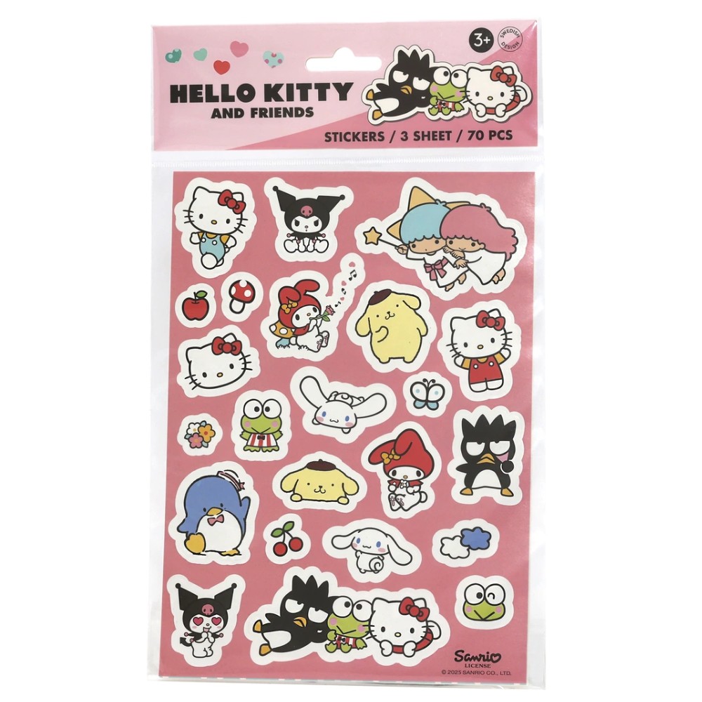 - Hello Kitty & Friends -tarra-arkit sisältävät 70 erilaista värikästä paperitarraa, joissa on Hello Kitty ja hänen ystävänsä ihastuttavissa asennoissa. Kolmelle tarra-arkille on painettu monipuolinen kokoelma hahmoja ja koristeellisia elementtejä, joita lapset voivat käyttää askarteluun, koristeluun tai opetusleikkeihin. Tikuteltavissa lahjoihin, kortteihin, piirustuksiin tai päiväkirjoihin- tarroilla voi koristella mielikuvituksen mukaan.