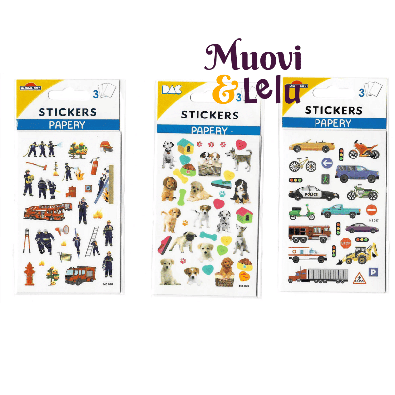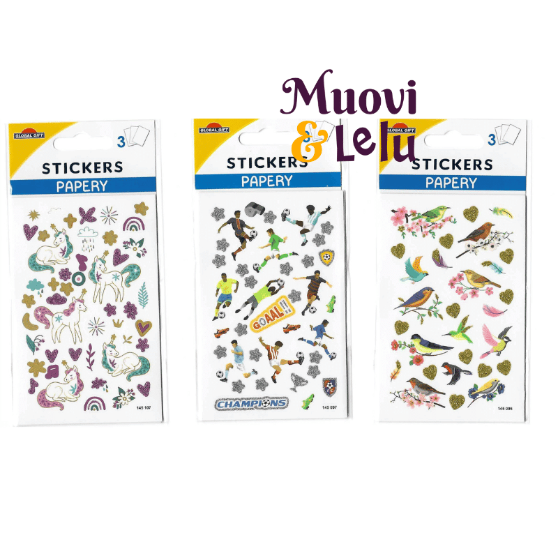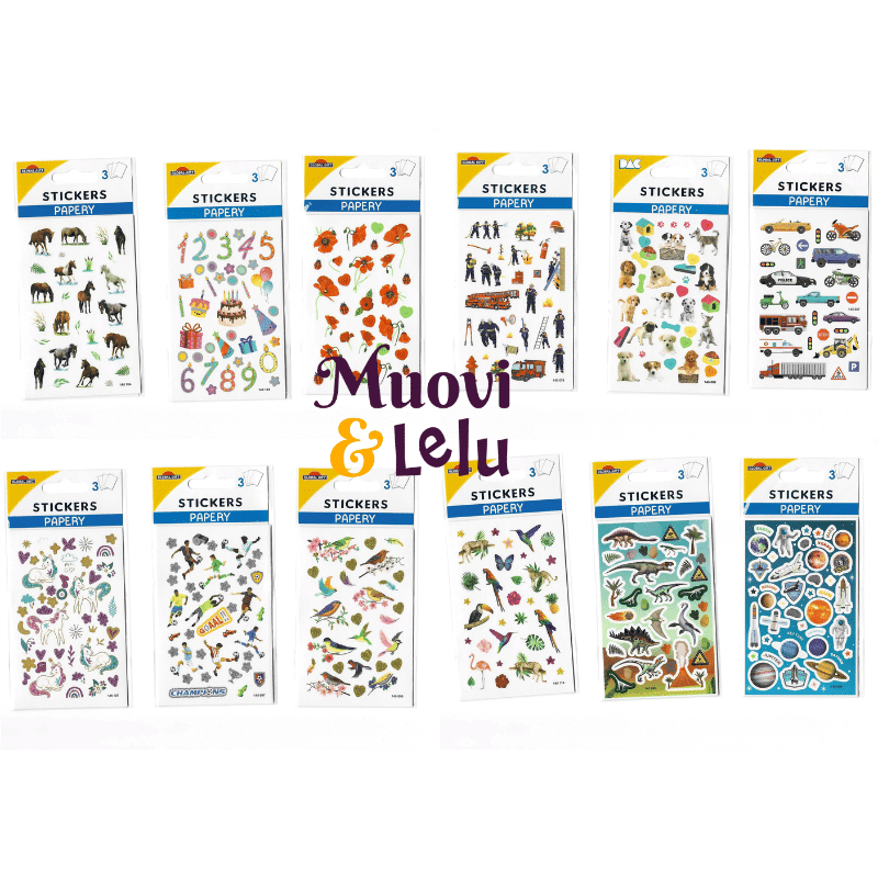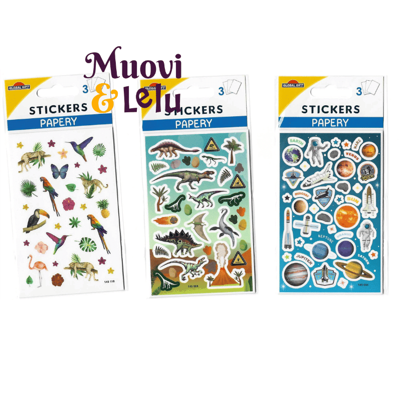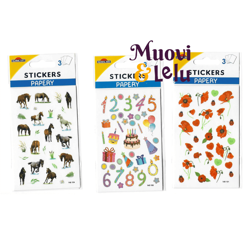 Kauniita Suomessa valmistettuja tarroja. Jokaisessa pakkauksessa on kolme arkkia. Lajitelmassa on paljon erilaisia kuvia, kuten autoja, eläimiä ja numeroita.