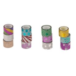 Koristeteippisetti sisältää 12 värikästä ja kimaltelevaa teippirullaa sekä 3 teippipidikettä. Täydellinen askarteluun, skräppäykseen ja lahjojen koristeluun.