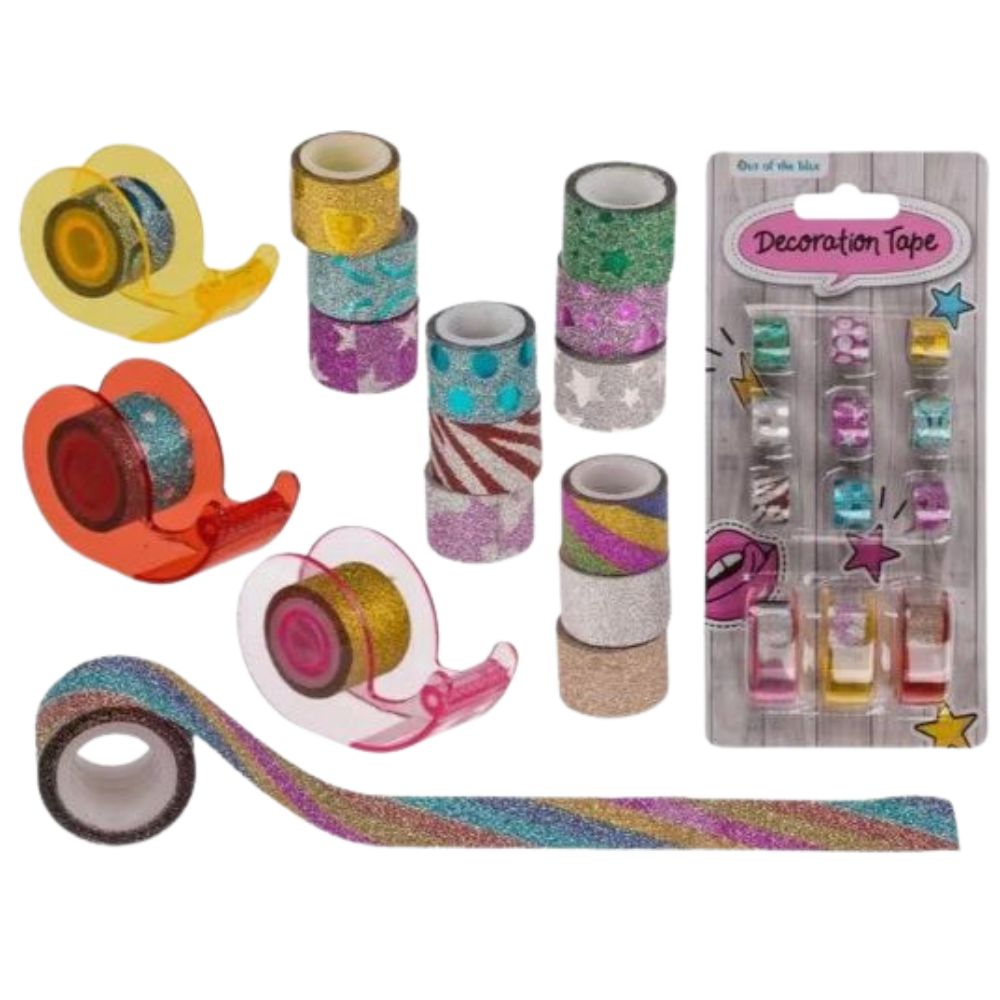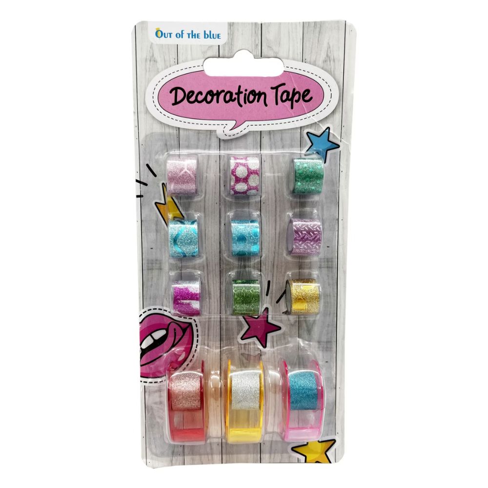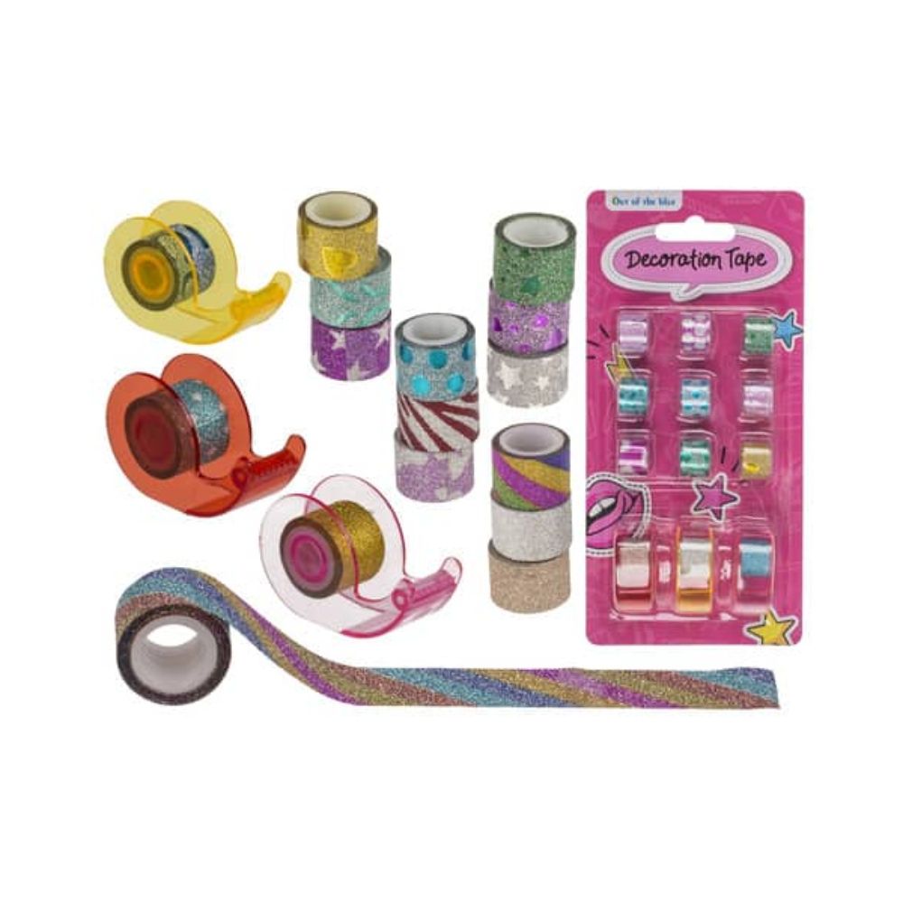 Koristeteippisetti sisältää 12 värikästä ja kimaltelevaa teippirullaa sekä 3 teippipidikettä. Täydellinen askarteluun, skräppäykseen ja lahjojen koristeluun.