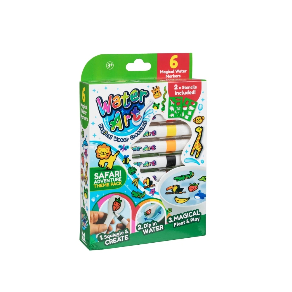 Taianomainen tapa piirtää ja leikkiä! Water Art -vesipiirustustussien avulla lapset voivat luoda kauniita safarikuvia vedellä aktivoituville pinnoille. Kuvio ilmestyy kuin taikaiskusta ja häviää kuivuessaan – aina uusi mahdollisuus piirtää ja kokeilla uudelleen.
