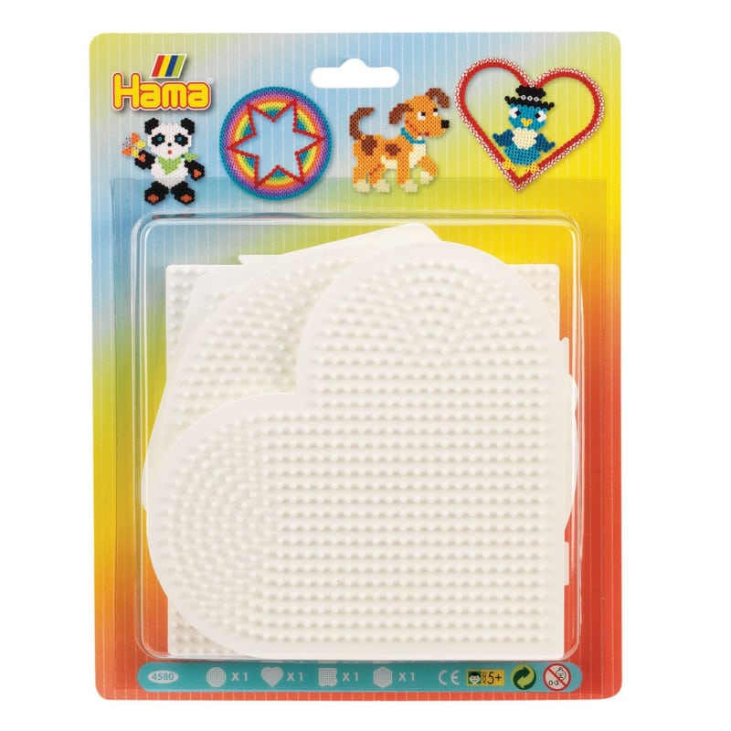 Neljä eri muotoista hama alustaa, joilla voit luoda monenlaisia hama teoksia. Pakkauksessa on sydän, ympyrä, kuusikulmio ja neliö.