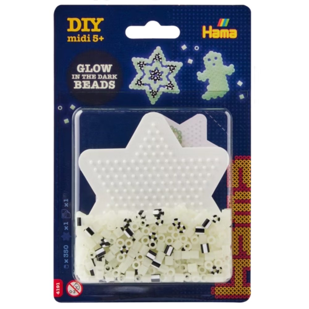 Tässä Hama-helmipakkauksessa on 375 pimeässä hohtavaa midi-helmeä. Mukana tulevat tarvikkeet tekevät askartelusta helppoa ja hauskaa, ja lopputuloksena syntyvät hehkuvat teokset ilahduttavat niin tekijäänsä kuin katsojaansakin.