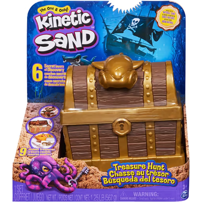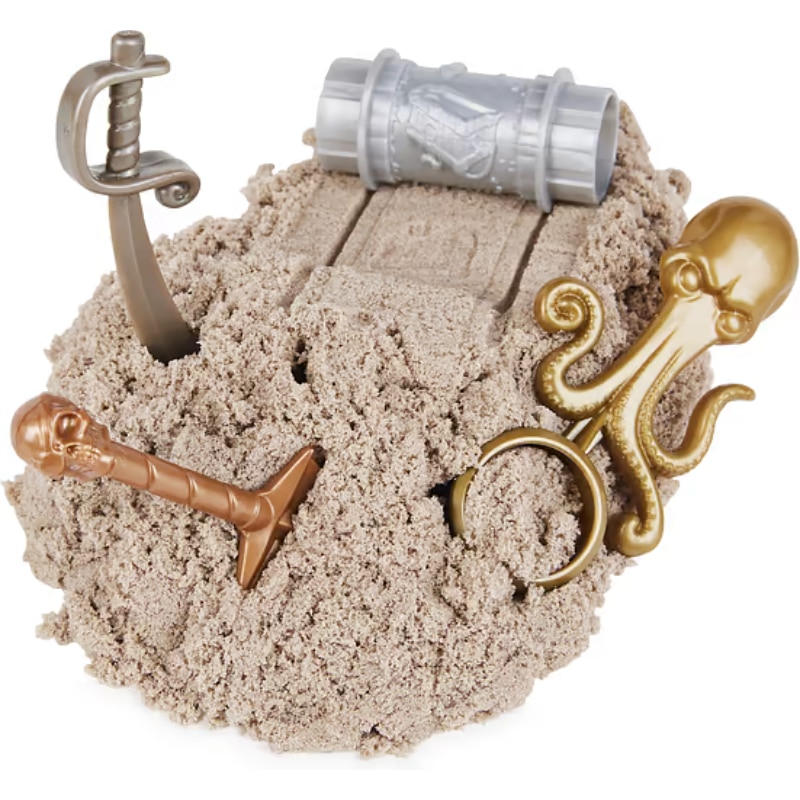Merirosvojen salainen aarrearkku on löytynyt! Kinetic Sand Treasure Hunt -leikkisetin avulla voit paljastaa kätketyn aarteen. Pakkaus sisältää neljä työkalua, 450 g ruskeaa hiekkaa, 110 g kultahiekkaa ja tarvikkeet. Avaa mystinen aarrearkku ja kaiva taikahiekan syövereistä kätketyt aarteet. Mukana oleva kineettinen taikahiekka on puristeltavaa ja helposti muotoiltavaa hiekkaa, joka ei tartu sormiin. Ainutlaatuinen koostumus tekee siitä erityisen pehmeän ja joustavan käsiteltäväksi! Valmistettu luonnonhiekasta. Ikäsuositus yli 3-vuotiaille.