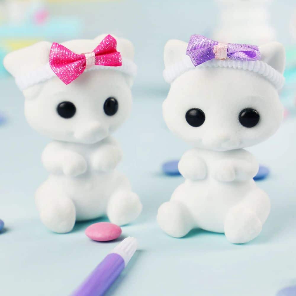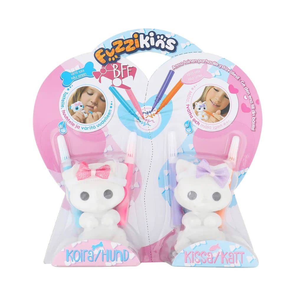 Ihastuttava toiminnallinen pakkaus, jonka sisällön avulla lapsi voi päästää luovuuden valloilleen värittämisen ja koristelun muodossa ja sitten leikkiä itsekoristelemallaan ihanalla figuurilla. Lapsi voi värittää hahmon haluamallaan tavalla pakkauksen mukana tulevilla tusseilla. Värit lähtevät flokatusta hahmosta pesemällä, eli sen voi värittää yhä uudelleen ja uudelleen. Fuzzikinsien kanssa leikkiminen kehittää lapsen luovuutta ja mielikuvitusta. Suloisiin leikkihetkiin!