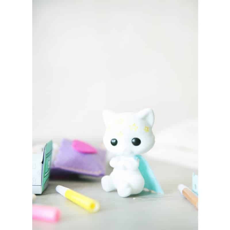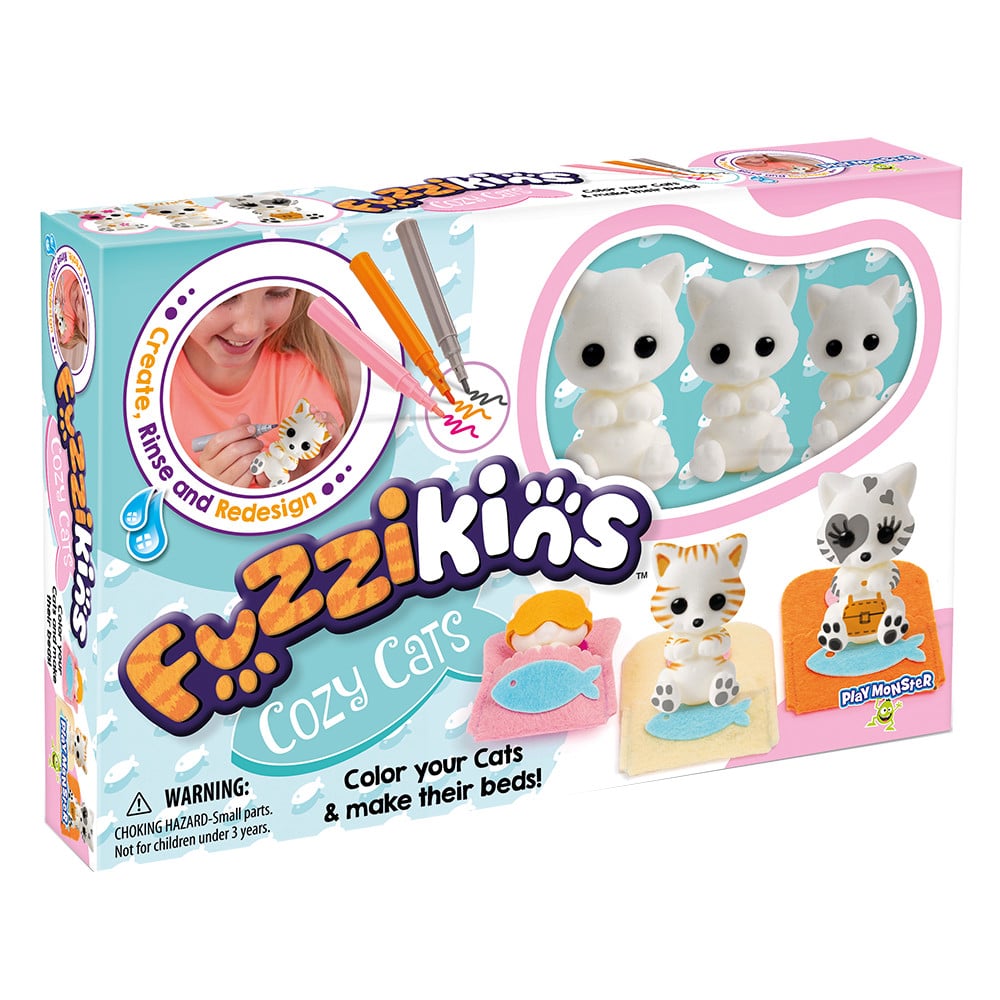 Hauska askartelusetti, joka on samaan aikaan lelu. Fuzzikinit ovat nukattuja lemmikkejä, jotka voit koristaa oman makusi mukaan. Suunnittele itse kissanpentusi. Voit värittää tusseilla kissat. Huuhtelemalla saat helposti väritykset pois, ja voit värittää kissan uudelleen!