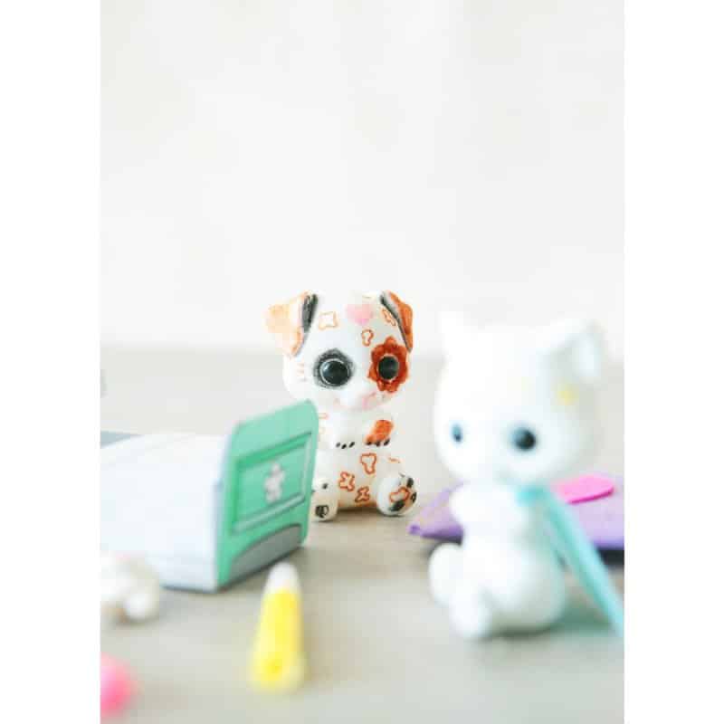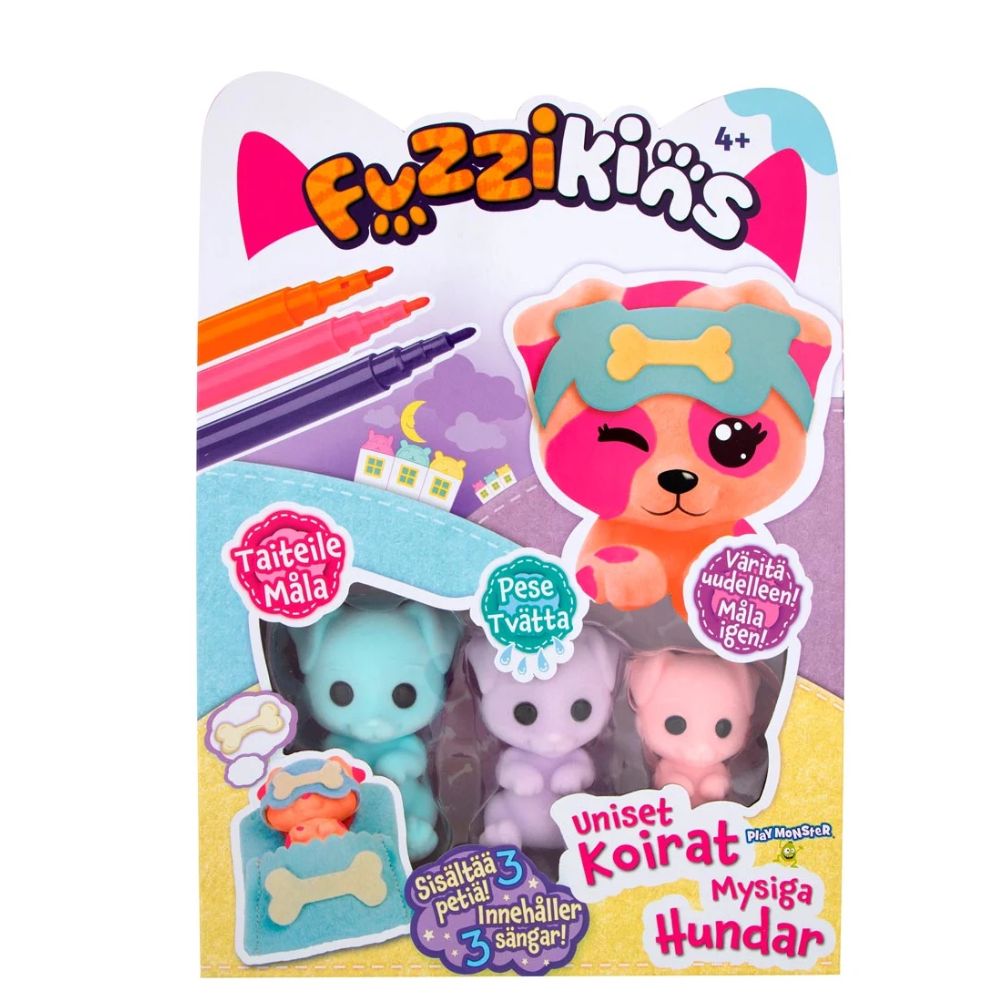 Hauska askartelusetti, joka on samaan aikaan lelu. Fuzzikinit ovat nukattuja lemmikkejä, jotka voit koristaa oman makusi mukaan. Suunnittele itse koiranpentusi. Voit värittää tusseilla koirat. Huuhtelemalla saat helposti väritykset pois, ja voit värittää koiran uudelleen!