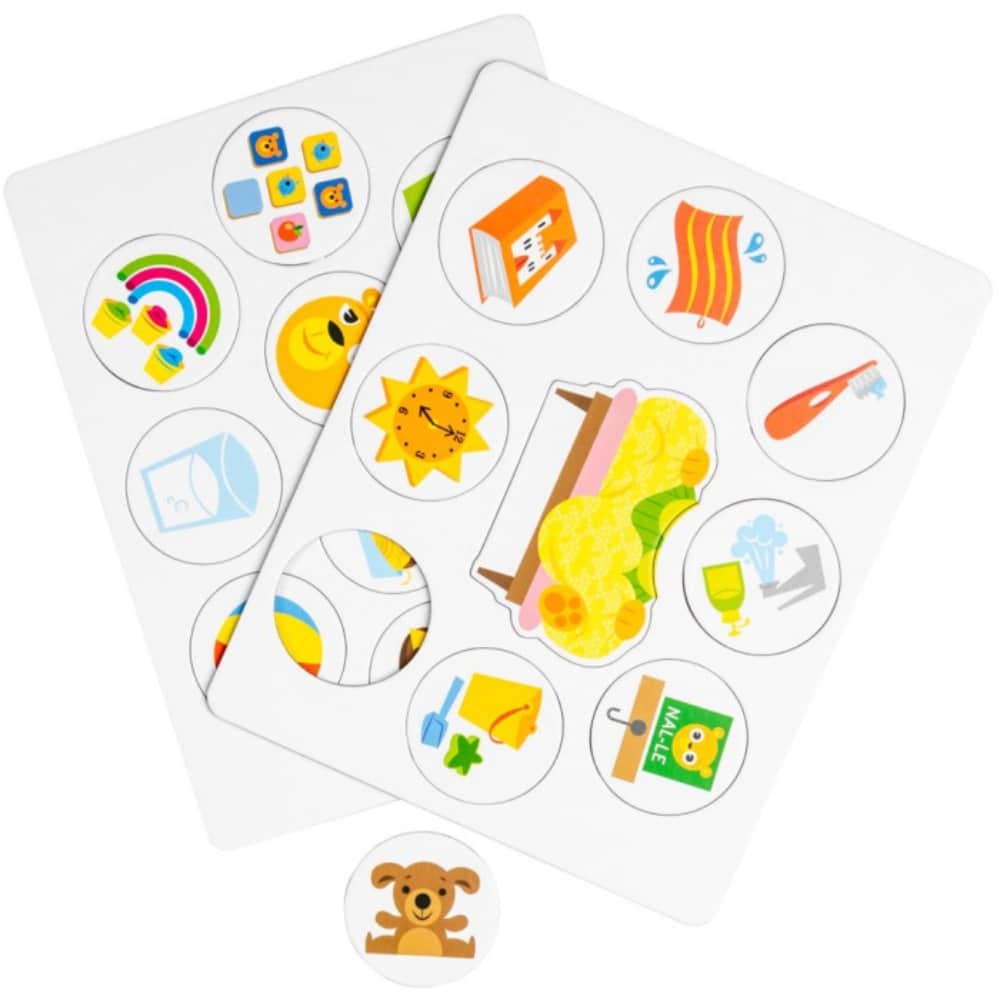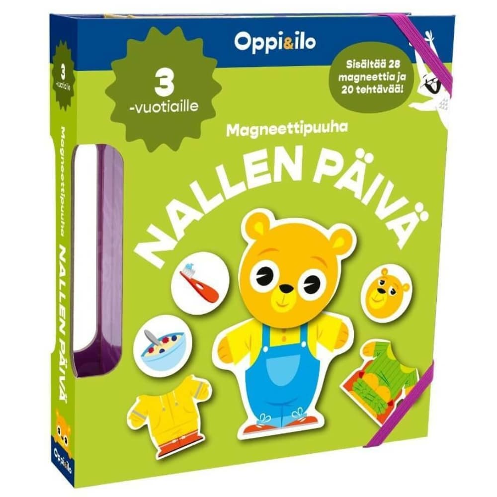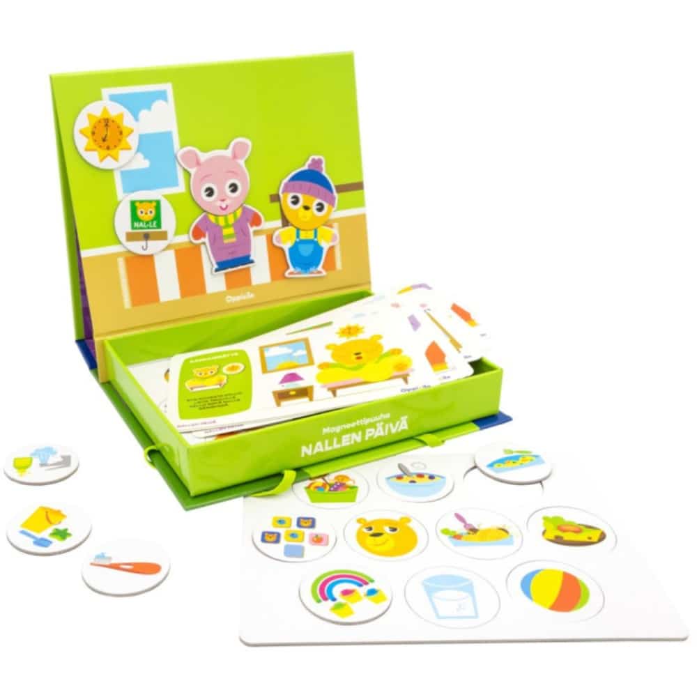 Tutustu arkirutiineihin ja päivän kulkuun yhdessä nallen kanssa. Iloinen Oppi&ilo Nallen päivä -magneettipuuha innostaa lasta leikkimään ja harjoittelemaan päivän rytmiä.