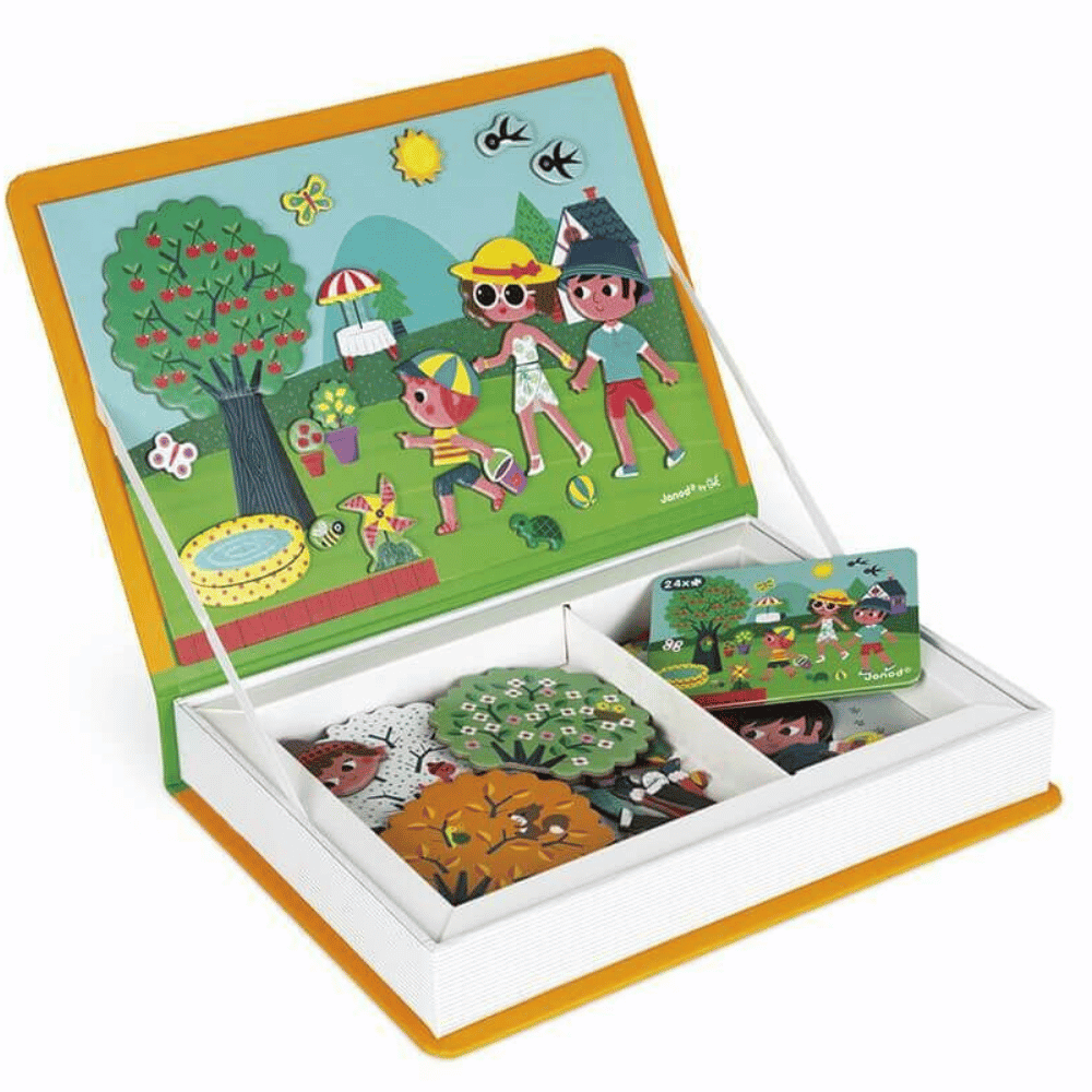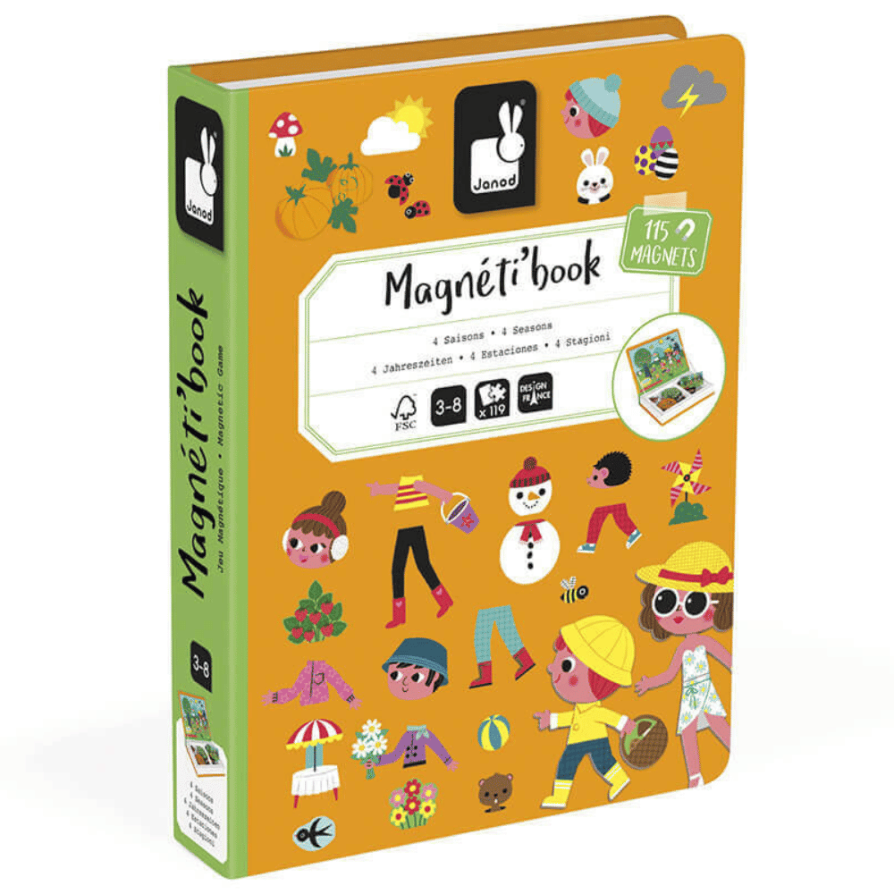 Janodin vuodenajat-magneettikirja on ihastuttava ja kehittävä lelu leikki-ikäiselle. Yhdistelemällä magneettiosia voit luoda saman maiseman neljänä eri vuodenaikana! Mikä muuttuu, kun syksy vaihtuu talveksi ja kevät kesäksi? Magneettikirjan mukana tulee 4 mallikorttia ja 115 magneettiosaa.