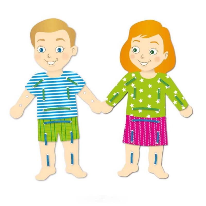 Pue ja riisu kartonkisia ompelunukkeja! Leikkien Ompelunuket -paketin kuvia on helppo yhdistää toisiinsa pujottelemalla naruja reikien läpi. Naruissa on kovetetut päät, mikä helpottaa pujottelua. Ompele kartonkisten nukkejen päälle mieleisesi asuyhdistelmä lukemattomista vaihtoehdoista! Kuinka pukisit nuket esimerkiksi juhliin tai rannalle? Pue, riisu ja yhdistele vaatteita mielesi mukaan! Narut on helppo purkaa pois, joten voit ommella kuvat yhä uudestaan. Ompeluleikit harjoittavat hauskalla tavalla lapsen hienomotorisia taitoja.