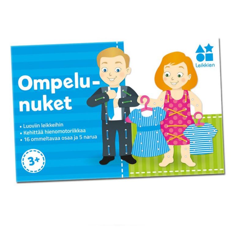 Leikkien Ompelunuket ompeluleikki sisältää kaksi kartonkista nukkea, joiden päälle voi ommella 14 erilaista kartonkista vaatekappaletta, sekä viisi eriväristä narua.