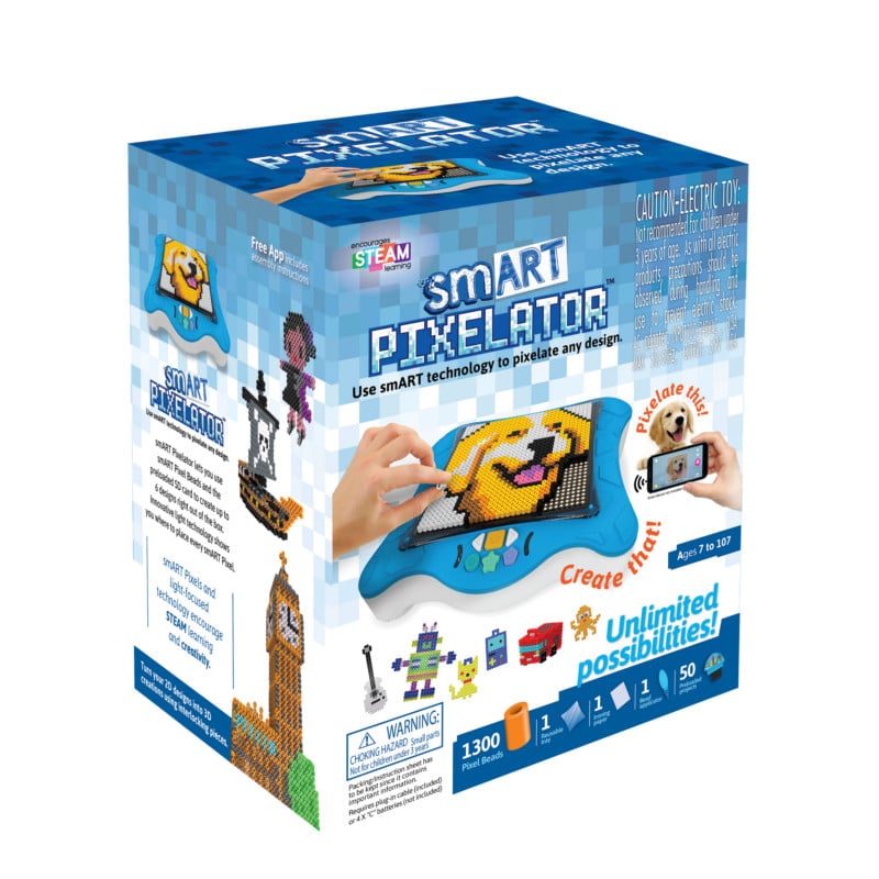 The smART Pixelator muuttaa kuvat pikselöidyiksi kuviksi. Mobiilisovelluksessa voi luoda 50 eri kuvaa vaihe vaiheelta. Liitä sovellus smART Pixelatoriin Bluetooth-yhteyden avulla, valitse mallisi, ja se näkyy smART Pixelatorin näytöllä. Mallien luominen ei ole vain hauskaa, vaan se myös auttaa lasta hienomotoristen taitojen ja näppäryyden kehittämisessä.