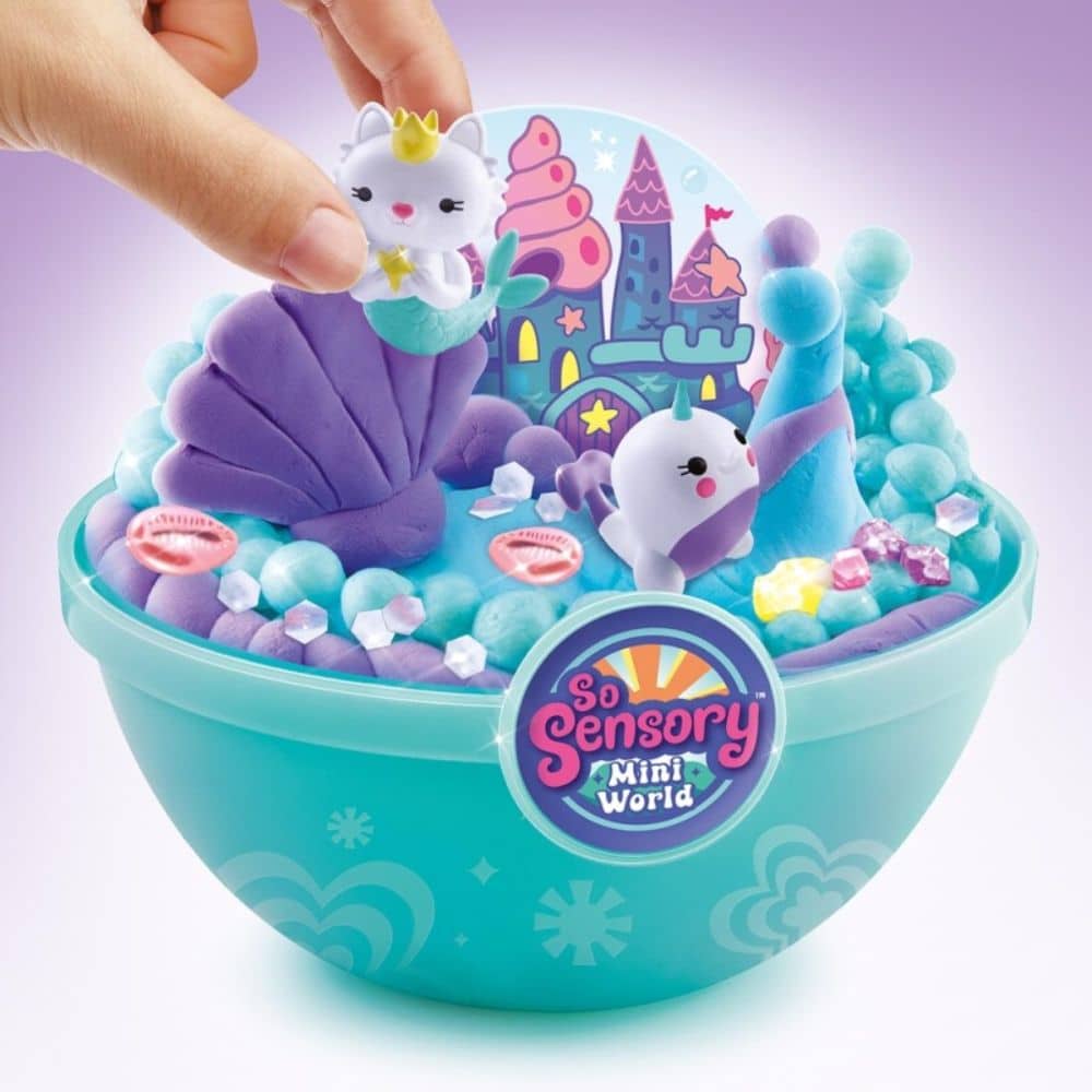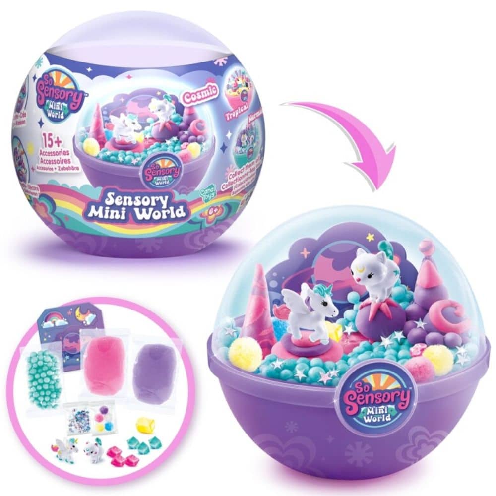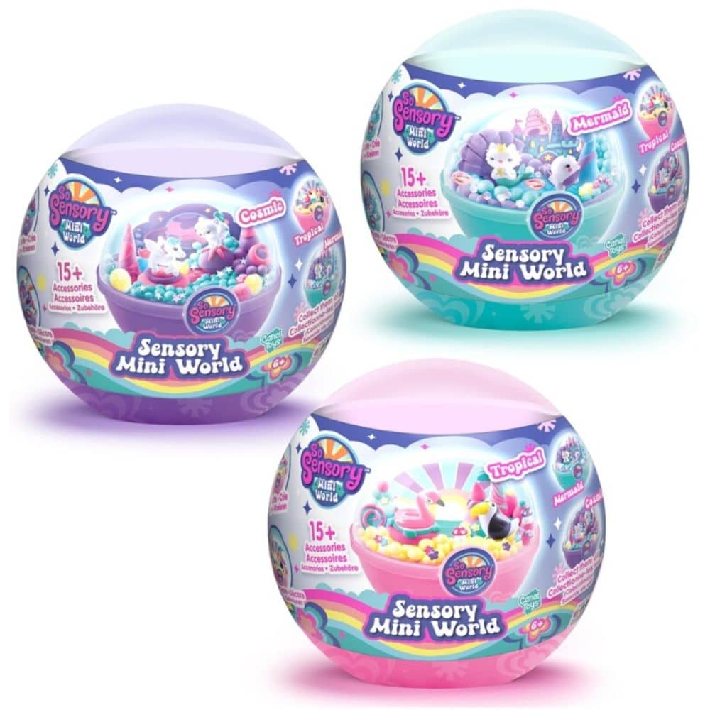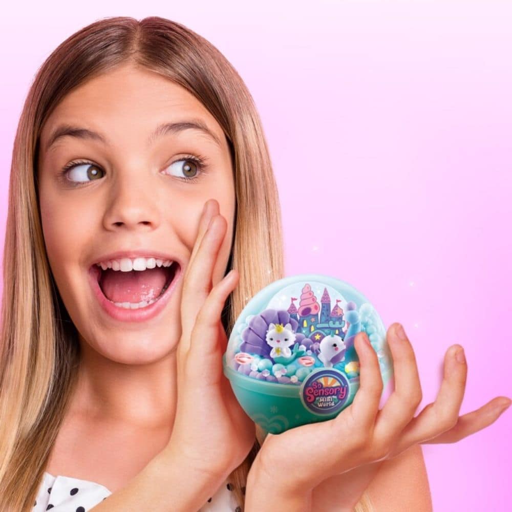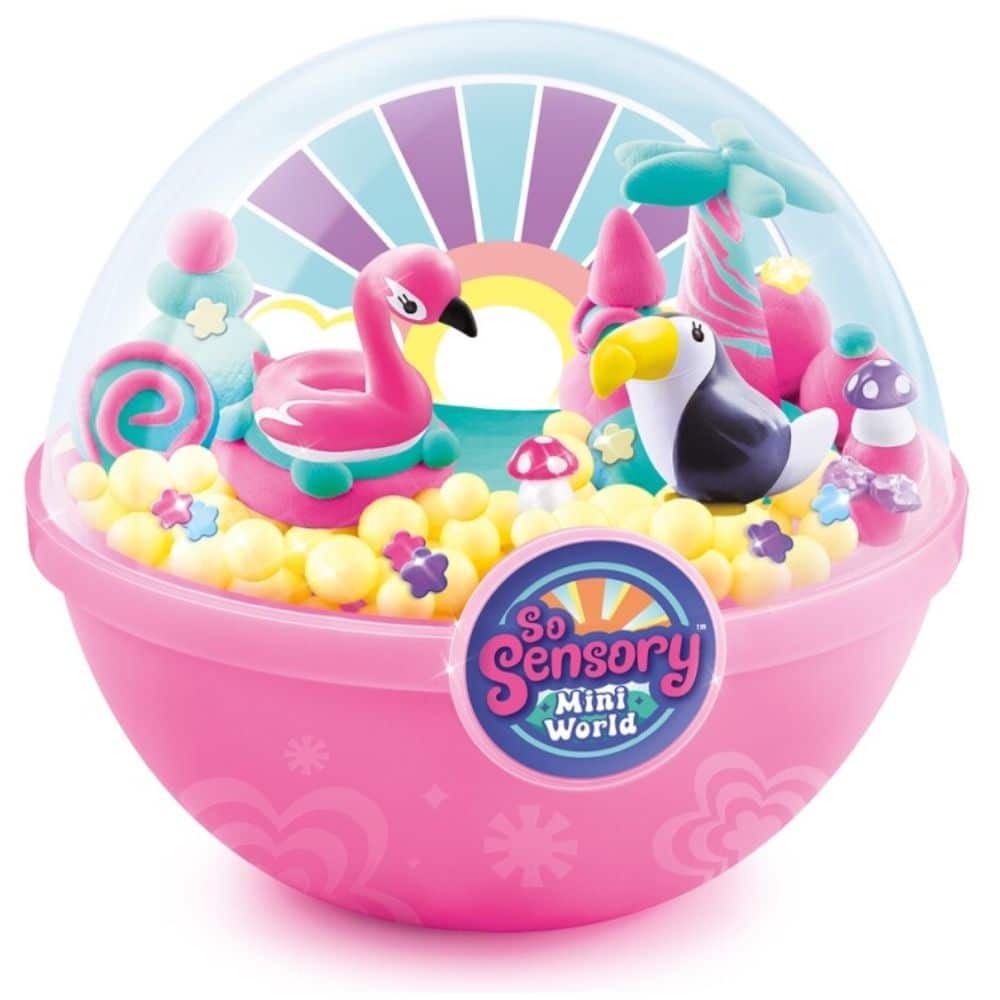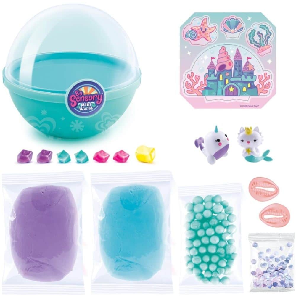 Yllätyspallo sisältää erilaisia muovailutarvikkeita, minihahmoja ja koristeita minikokoisen maailman tekemiseen.