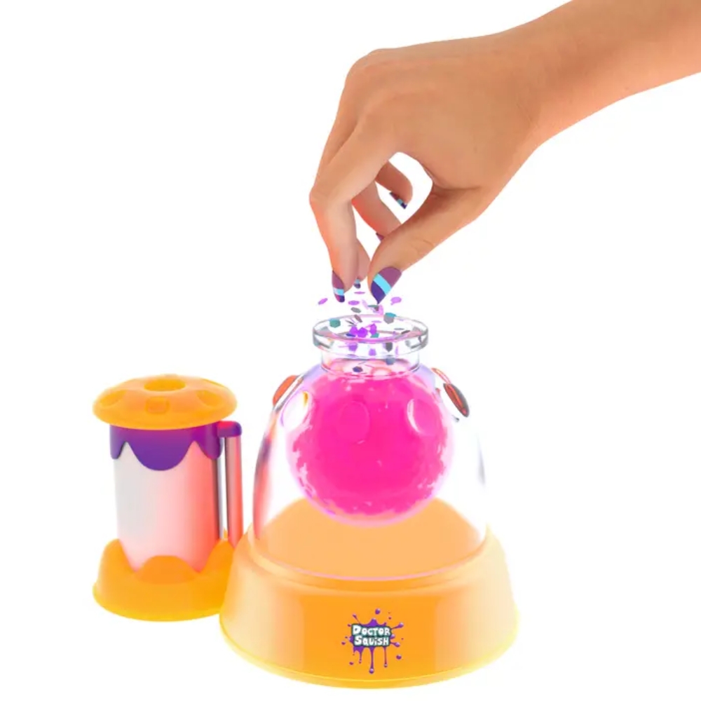 Doctor Squish puristelupallon tekokone – Doctor Squish -koneella voit tehdä itse puristelupalloja helposti kotonasi! Lisää koneeseen vain ilmapallo, täytä ilmapallo pumppaamalla ilmalla, lisää mittalusikalla limajauhe, koristeet ja muutama tippa haluamaasi väriä. Lopuksi kaada päälle vettä pintaan asti.