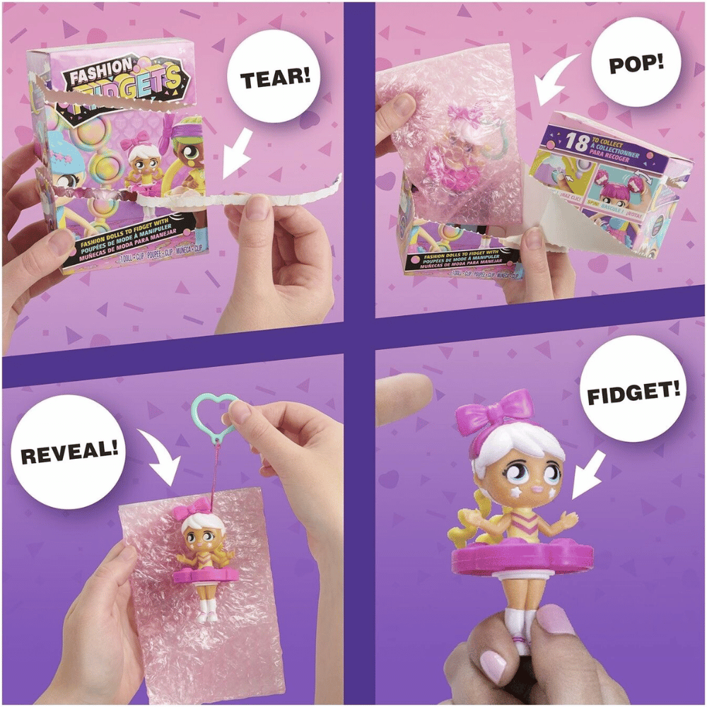 Fashion Fidgets nukke yllätys – Tässä lelussa stressilelu kohtaa muotinuken. Ota nukke mukaasi minne tahansa! Kaikki nuket on varustettu koukulla, jonka voit kiinnittää reppuun.