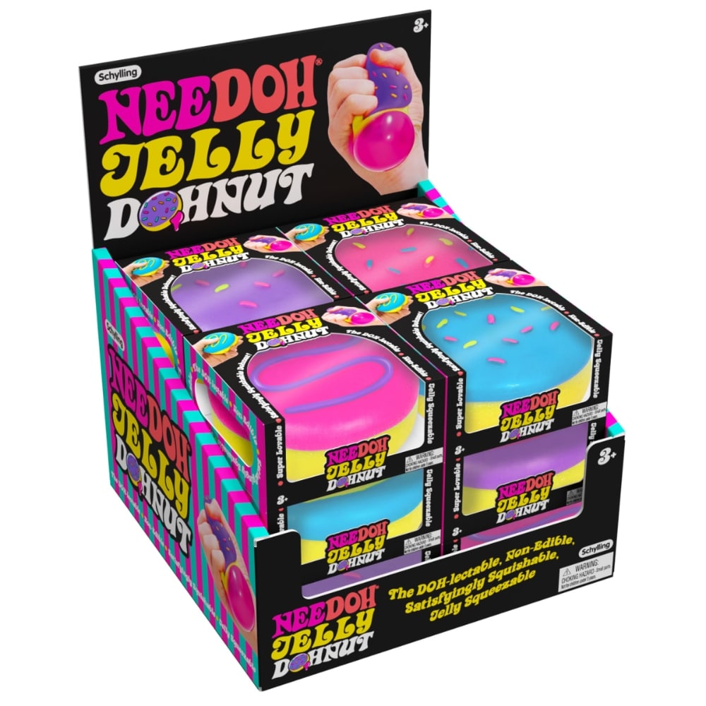 Purista herkullisia donitseja ja katso, miten ne palautuvat taianomaisesti alkuperäiseen muotoonsa. Needoh Jelly Dohnut on munkkia muistuttava stressilelu, jossa on irrotettava kuorrutuspinta. Näitä Needoh:n donitseja on kolme eri väriä, jotka ovat sininen, pinkki ja liila. Lisäksi niiden päällä on kolmea erilaista kuviota, joten yhteensä on 9 erilaista kuorrutusta!