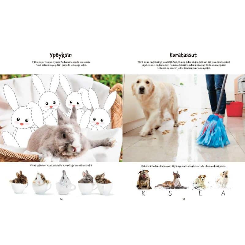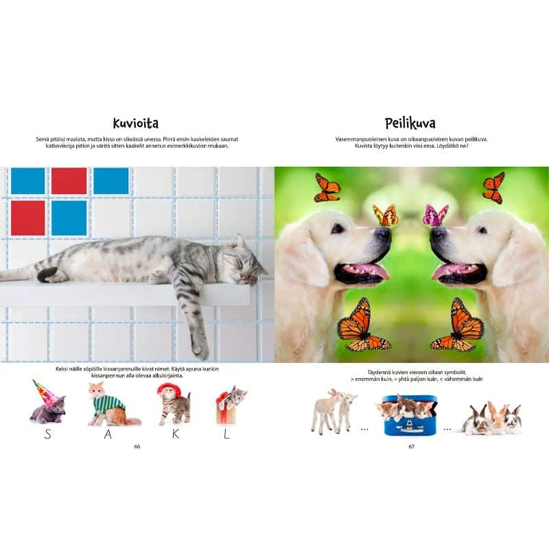 Harjoittele hauskojen eläinten kanssa monenlaisia tehtäviä: tarkkaavaisuutta, päättelyä, yhdistelyä, laskemista sekä kynänkäyttöä. Tehtävät sopivat esiopetusikäisille ja pienille koululaisille. Vanhempien apu voi olla tarpeen tehtäviä ratkaistaessa.