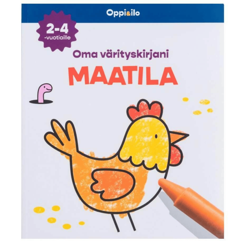 Oppi&ilo Oma värityskirjani maatila on lapsen ensimmäinen värityskirja. Selkeät ja isot kuvat paksuilla ääriviivoilla on helppo värittää. Oppi ja ilo -sarjan Oma värityskirjani maatila sisältää kuvia tutuista maatilan eläimistä, rakennuksista ja kulkuneuvoista. Lasten suosikit mm. lehmä, possu ja hevonen saavat iloisen värin, kun pienen lapsen luovuus pääsee valloilleen! Se pysyykö väri viivojen sisäpuolella ei ole vielä merkityksellistä! Pääasia on ilo, jonka luova värityshetki tuo. Selkeiden kuvien avulla on kuitenkin helppo harjoitella kynän käyttöä ja harjaannuttaa väritystaitoja. Pikkuhiljaa väri löytää paikkansa ääriviivojen sisäpuolelta. Vahvat ääriviivat helpottavat hahmottamista ja huolellisuutta.