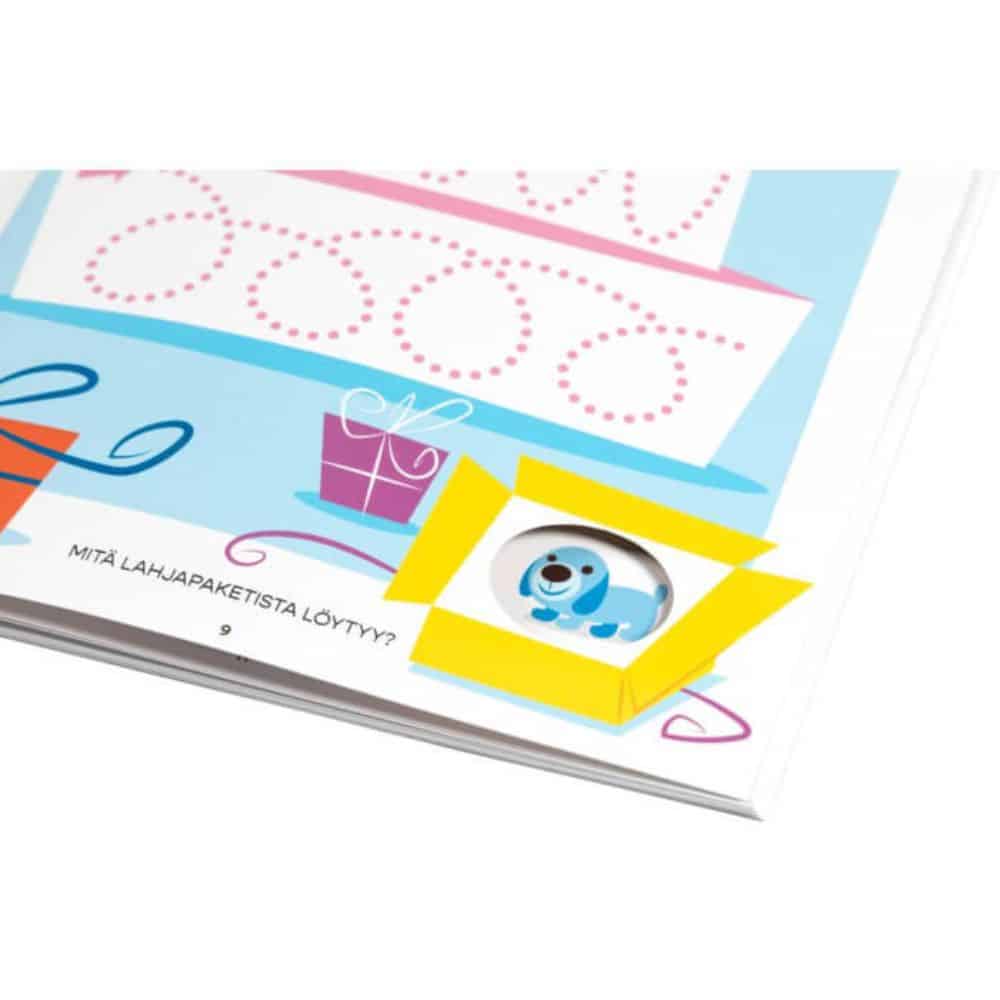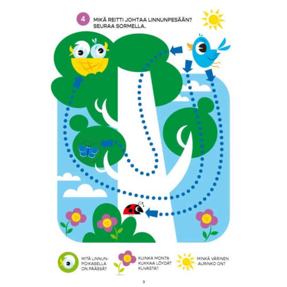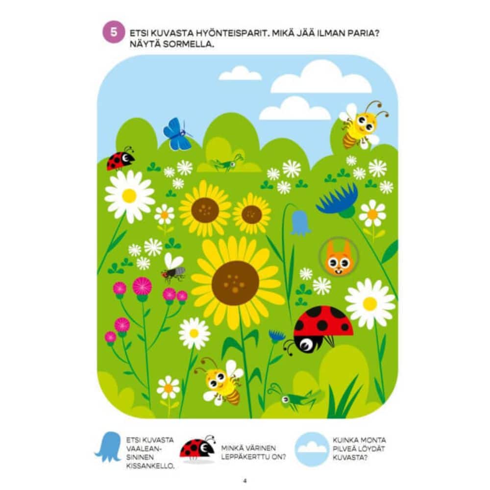 Pompi sormella jäniksen loikat ja etsi parit ötököille. Etsi ja tunnista pesästään kurkistavat eläimet. Lapsen ensimmäiset puuhatehtävät ratkotaan kynän sijaan sormella, ja sivujen kurkistuskolot tekevät puuhailusta erityisen hauskaa! Monipuoliset tehtävät kehittävät tarkkaavaisuutta, silmän ja käden yhteispeliä sekä sanavarastoa. Sisältö on suunniteltu tukemaan lapsen onnistumisen tunnetta, vahvistamaan itseluottamusta ja lisäämään intoa uuden oppimiseen. Tämän puuhakirjan parissa lapsi viihtyy yhä uudelleen ja uudelleen!
