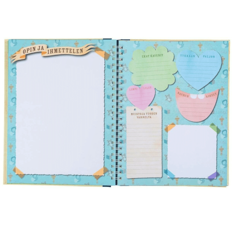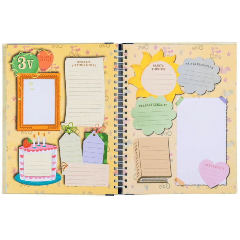 Oppi&ilo Minun kirjani kerää talteen lapsuusvuosien tärkeät muistot, hauskat tilanteet ja oppimisen onnenhetket. Kirjasta löytyy täytettävät sivustot jokaiselle ikävuodelle aina syntymästä kymmeneen ikävuoteen asti. Oma paikkansa on varattu niin syntymäpäivämuistoille, koulukuville kuin vuoden tärkeimmille tapahtumille. Käteviin taskuihin sujahtavat piirustukset, todistukset, valokuvat sekä kaikki muut säilytettävät aarteet. Lapsen kasvaessa hän saa itse täyttää sivuja tärkeillä muistoillaan. Kirjaan tallentuvat kaikki lapsuuden rakkaat hetket, tapahtumat ja ajatukset.
