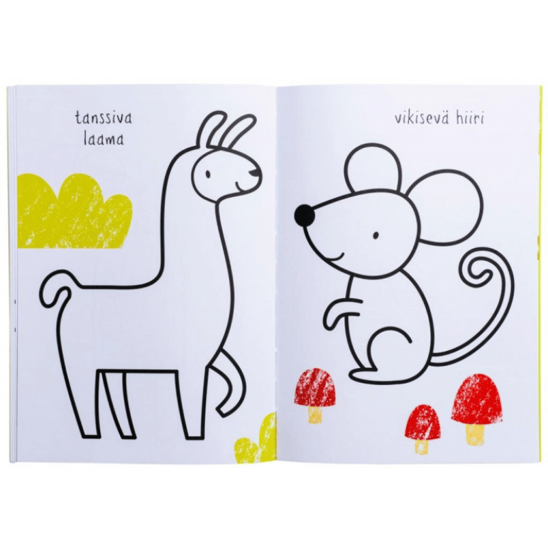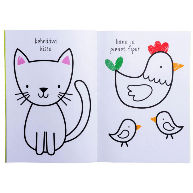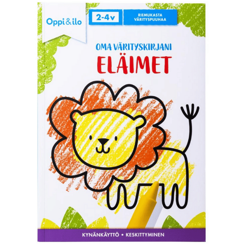 Oppi&ilo Oma värityskirjani eläimet on lapsen ensimmäinen värityskirja! Selkeät ja isot kuvat paksuilla ääriviivoilla on helppo värittää. Oppi ja ilo -sarjan Oma värityskirjani eläimet sisältää kuvia tutuista eläimistä. Lasten suosikit mm. vikkelä jänis, vikisevä hiiri, tanssiva laama ja lentävä lepakko saavat iloisen värityksen, kun pienen lapsen luovuus pääsee valloilleen! Se pysyykö väri viivojen sisäpuolella ei ole vielä merkityksellistä! Pääasia on ilo, jonka luova värityshetki tuo. Selkeiden kuvien avulla on kuitenkin helppo harjoitella kynän käyttöä ja harjaannuttaa väritystaitoja. Pikkuhiljaa väri löytää paikkansa ääriviivojen sisäpuolelta. Vahvat ääriviivat helpottavat hahmottamista ja huolellisuutta.