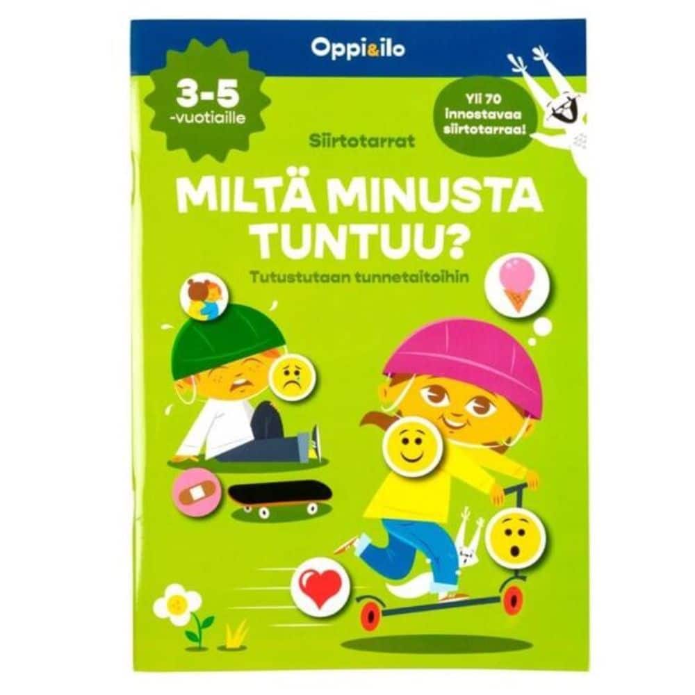 Hauska tehtäväkirja, jossa tunnetaitoihin keskittyviä tehtäviä ratkotaan siirtotarrojen avulla.