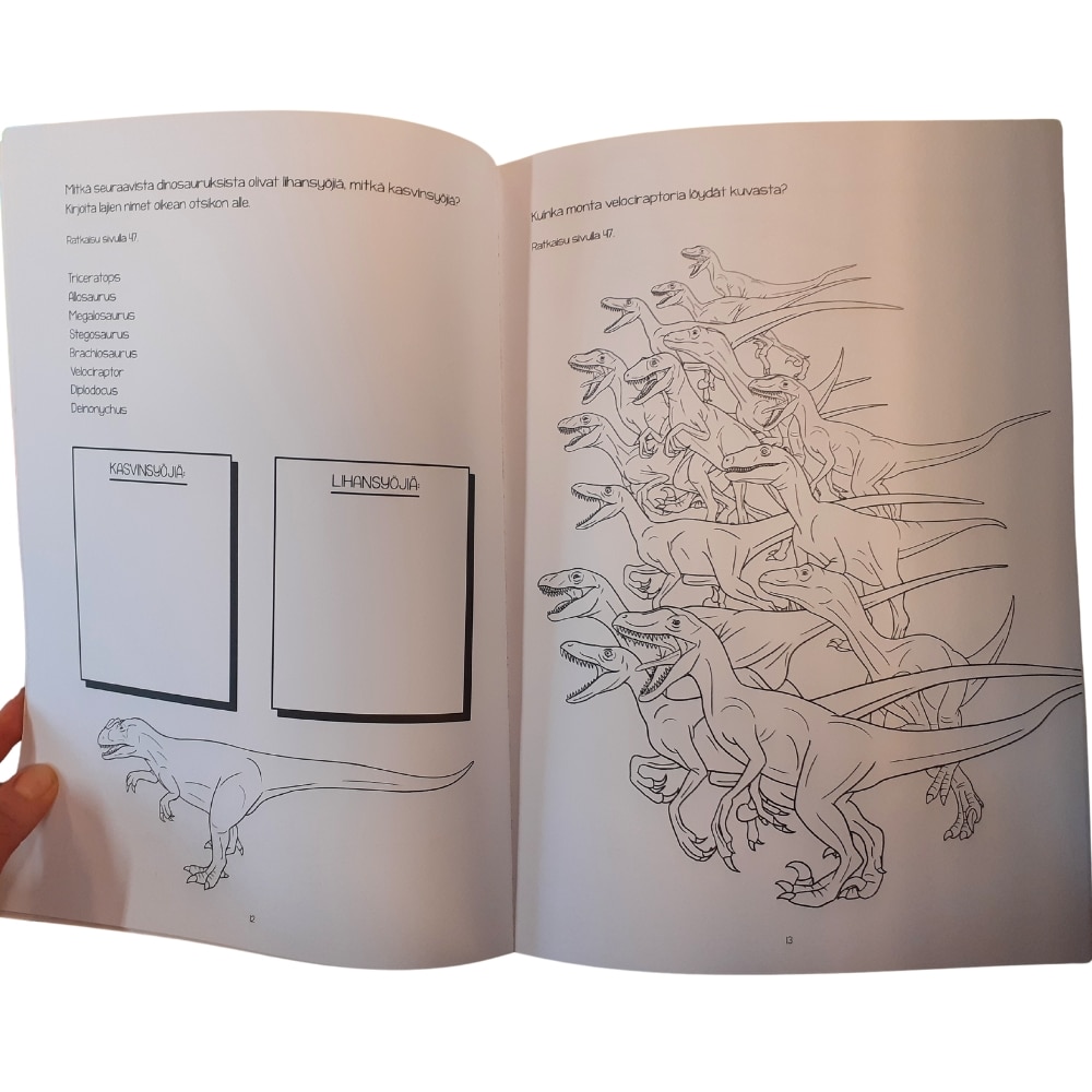 Terävähampaiset, sulavaliikkeiset pedot ja jykevästi panssaroidut kasvinsyöjät riistäytyvät valloilleen tässä huimassa puuhakirjassa. Tee rohkea aikahyppy miljoonien vuosien päähän muinaisuuteen ja ratkaise hirmuliskoaiheisia tehtäviä. Pysy valppaana, niin selviät! Kehittää lapsen hienomotorisia taitoja ja hahmotuskykyä.