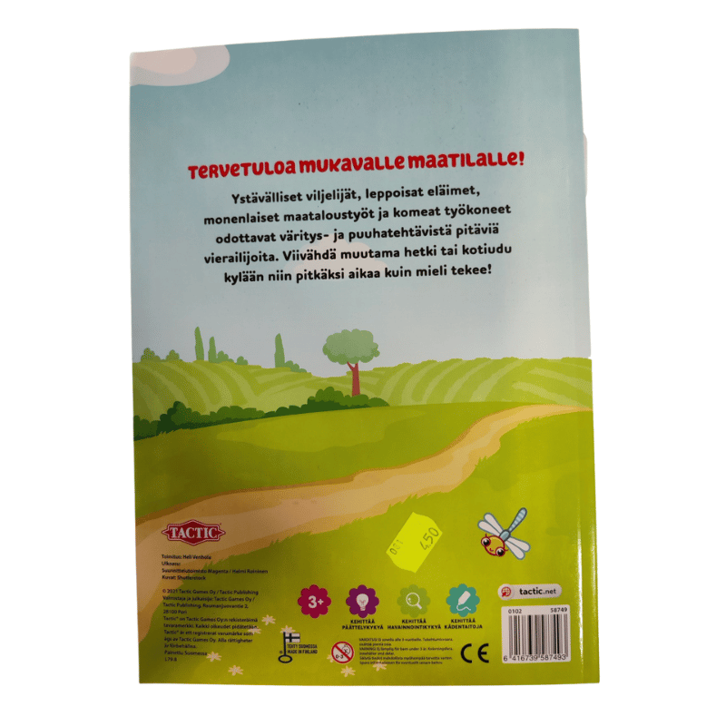Ystävälliset viljelijät, leppoisat eläimet, monenlaiset maataloustyöt ja komeat työkoneet odottavat väritys- ja puuhatehtävistä pitäviä vierailijoita. Viivähdä muutama hetki tai kotiudu kylään niin pitkäksi aikaa kuin mielesi tekee! Värittäminen kehittää lapsen hienomotorisia taitoja ja hahmotuskykyä.