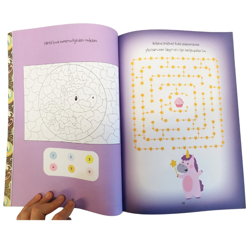 Hurmaava Yksisarviset ystävät -puuhakirja on täynnä hauskaa tekemistä taianomaisten yksisarvisten parissa. A4-kokoisessa puuhakirjassa on erilaisia tehtäviä, jotka auttavat kehittämään päättely- ja havainnointikykyä sekä kädentaitoja.