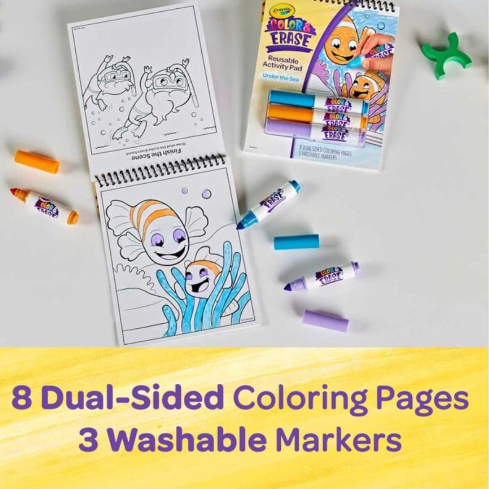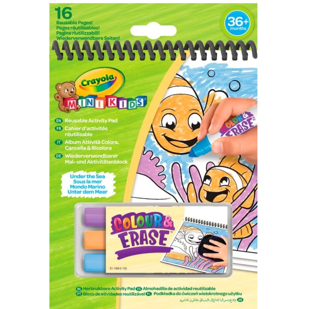 Värityslehtiö kalat ja tussit Crayola – Piirrä hauskoja kuvia, pyyhi kostealla pyyhkeellä ja piirrä uudestaan! Kierrevihossa on kahdeksan kaksipuoleista sivua eli 16 kuvaa, joihin voi mukana tulevilla tusseilla piirtää aina uudestaan.