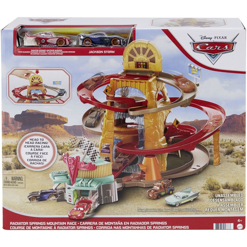 Pakkaus sisältää kiemurtelevan kilparadan, vesiputouksen, kahvilan, pysäköintipaikat, kaasupumpuns sekä noin 7 cm pitkät Lightning McQueen- ja Jackson Storm-kilpa-autot.