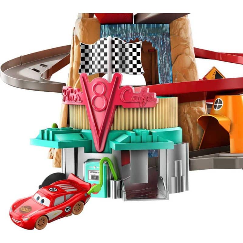 Nyt Disneyn ja Pixarin Cars:in-fanit voivat matkustaa takaisin ikonisiin nähtävyyksiin ja karuun maastoon Radiator Springsin ympäristöön! Jännittävä kahden auton kilpailu motellin vuoren huipulta menee vesiputouksen, luolien ja rakennusten läpi maaliin: Flo’s V8-kahvilaan. Kun painat motellin pyöräkaivon alas käynnistät kilpailun, jolloin autot lähtevät alas vuorelta. Kuka voittaa kilpailu? Radanvaihtajat tekevät jokaisesta kilpailusta erilaisen, ja ruudullinen lippu ilmoittaa jokaisen ajon voittajan.