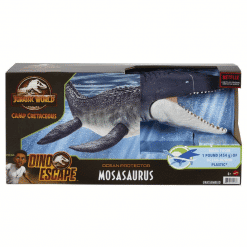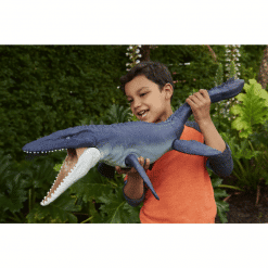 Uskallatko sukeltaa Jurassic World Mosasauruksen matkassa merten syvyyksiin? Tällä 43 cm pitkällä merten jättiläisellä on valtava avautuva kita, jolla se helposti nappaa isommatkin saaliit. Valmistuksessa on käytetty merestä kerättyä jätemuovia.