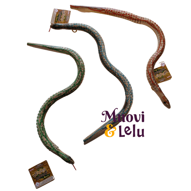 Katso miten puinen käärme liikkuu aidosti käärme maisesti. Puisen käärmeen pituus on noin 50 cm ja siinä oin hienoja maalattuja käärmeen suomuja. Lajitelmassa on kolme eri väristä: vihreä, sininen ja oranssi.