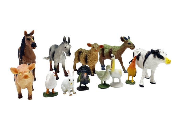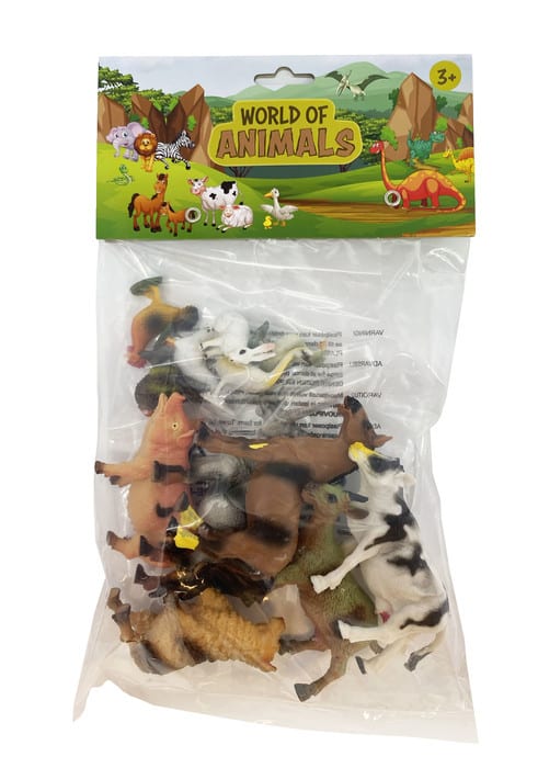 Muovisia kotieläinfiguureja lapsille. Pussissa 12 erilaista kotieläintä, kuten lehmä, hevonen ja lammas. Sopii leikkeihin ja oppimiseen.