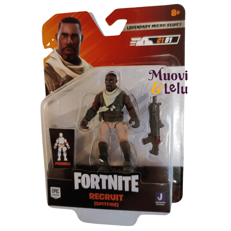 Fortnite Recruit-hahmolla on liikkuvia nivelpisteitä ja hienoja yksityiskohtia sekä oma ase taisteluja varten. Hahmon korkeus on noin 6 cm. Sarjasta 1 C1S1.