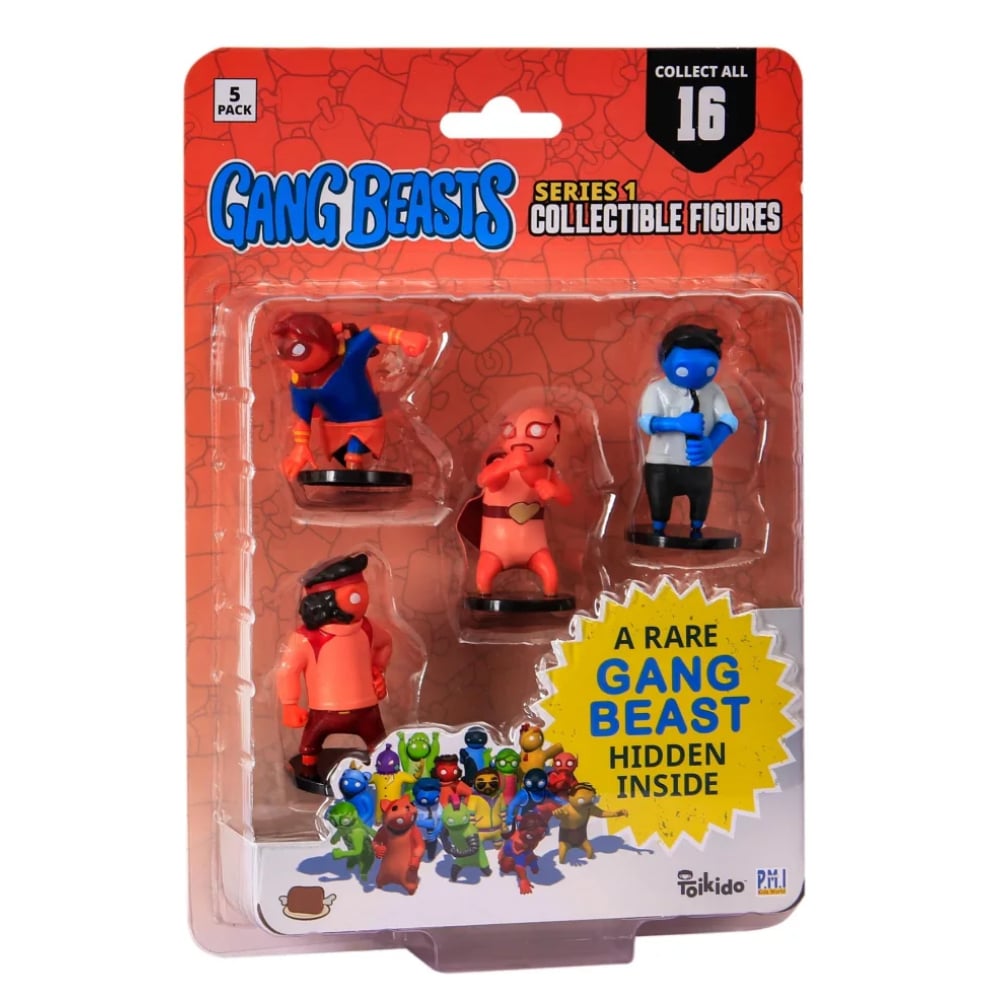 Kerää nyt Gang Beasts-pelistä tutut hahmot! Gang Beasts hahmo 5 kpl lajitemassa on yhteensä 16 keräilyhahmoa. Jokaisessa paketissa on viisi kappaletta 5-6,5 cm korkeaa hahmoa. Neljä hahmoa on nähtävillä ja viides on yllätys.